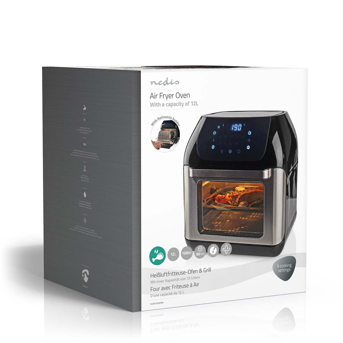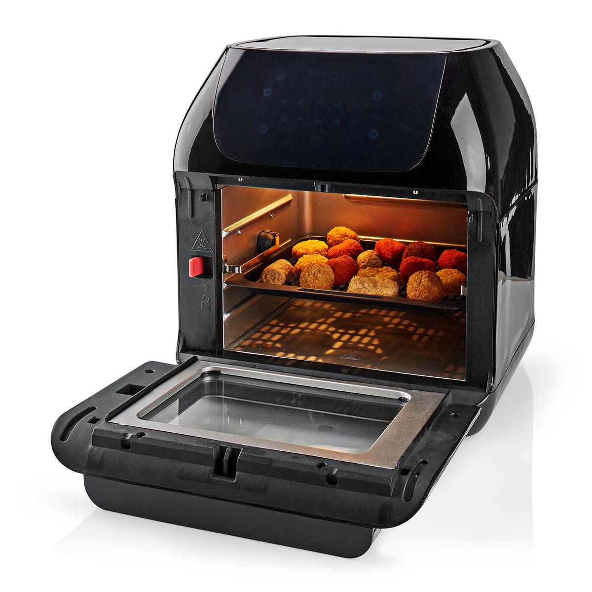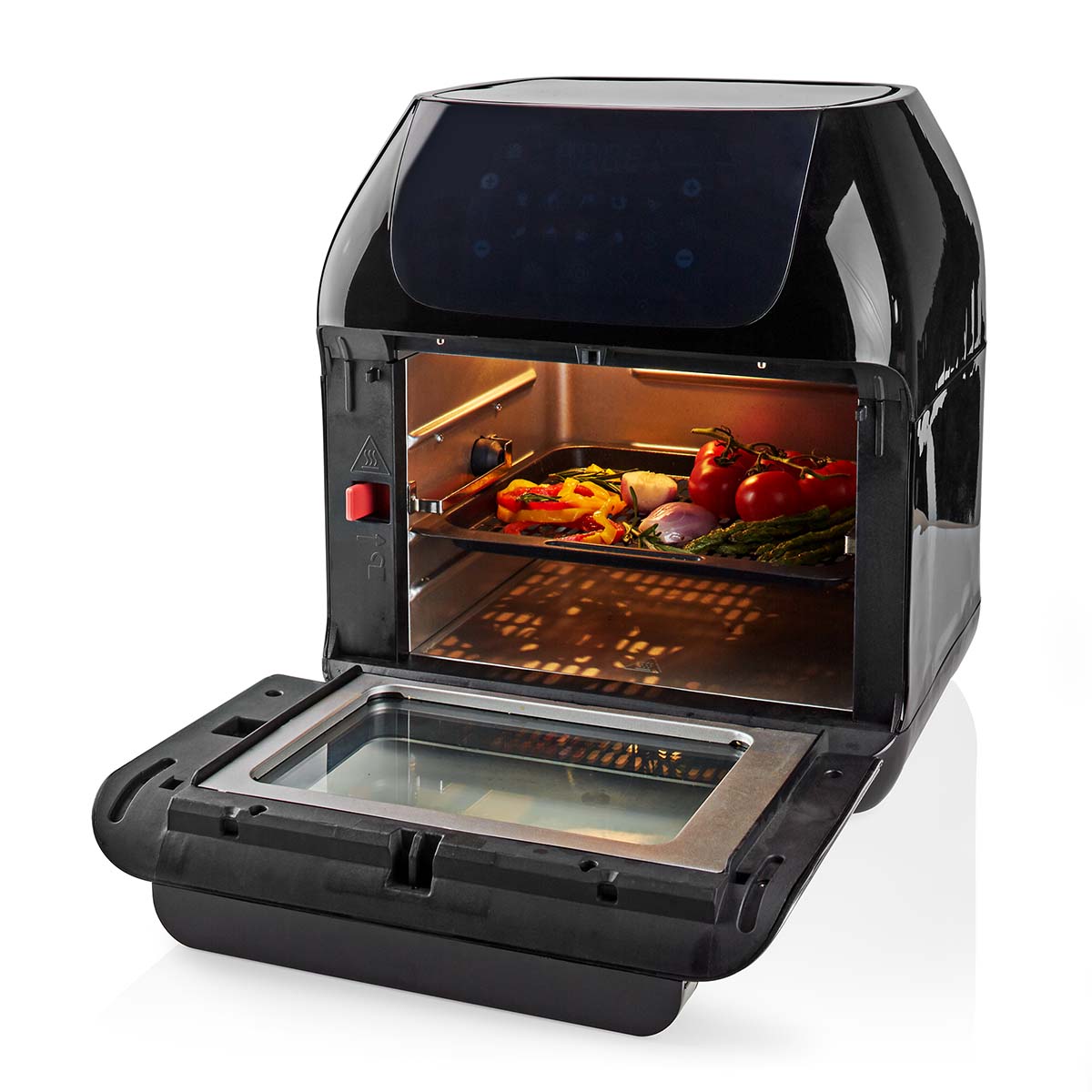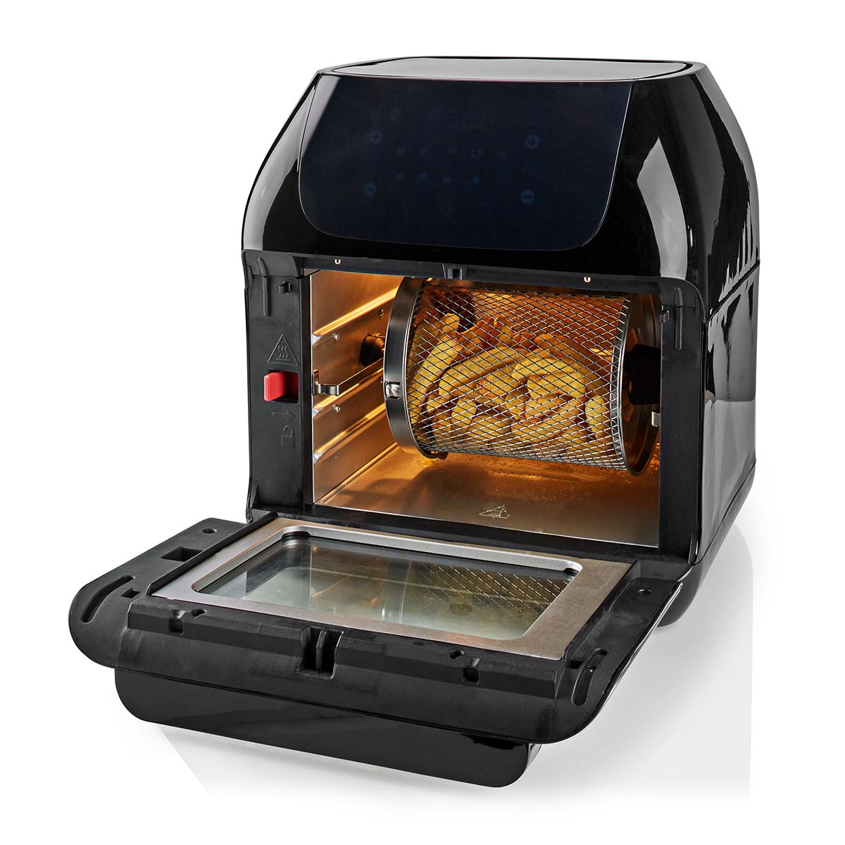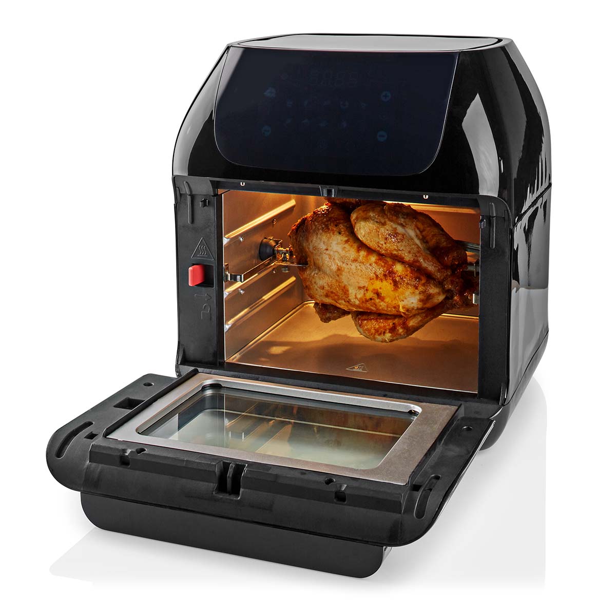 Gezond frituren zonder olie! Multifunctionele 12L heteluchtfriteuse-oven met draaispit en 9 programma's. Grill, bak en rooster voor het hele gezin tegelijk.