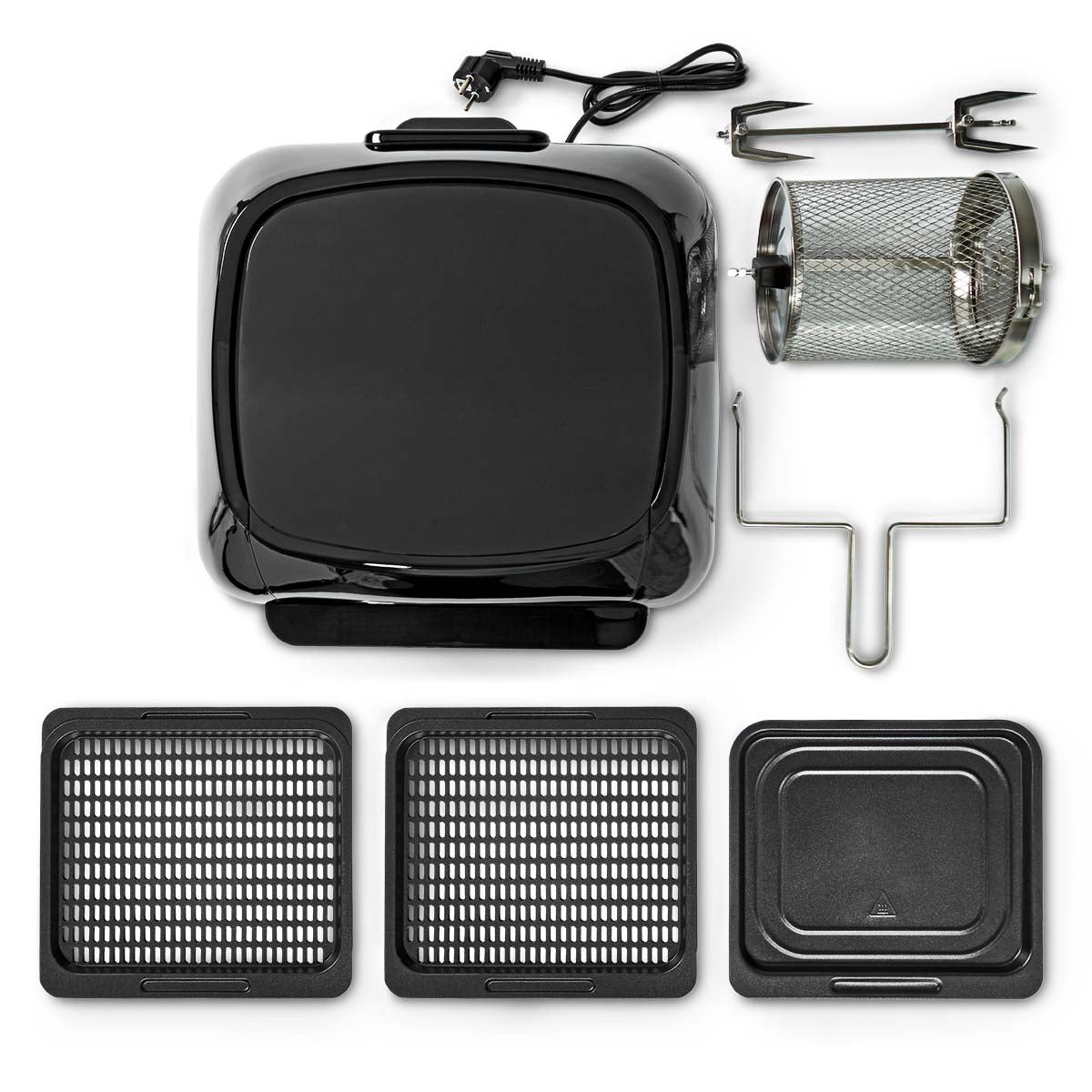 De heteluchtfriteuse-oven wordt geleverd met een bakplaat en twee grillroosters, zodat je op verschillende niveaus tegelijkertijd kunt koken. Daarnaast wordt hij geleverd met een draaispitmand om de beste en knapperigste patat te maken, en met een draaispit voor kip.