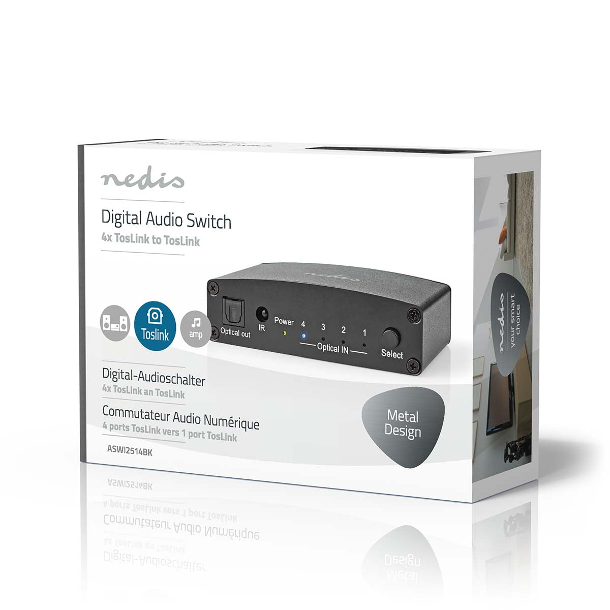 Sluit 4 digitale audioapparaten aan op 1 uitgang met deze compacte Toslink-switch. Verliesloos geluid, tot 5m kabellengte. Plug & play installatie voor thuis of professioneel gebruik.