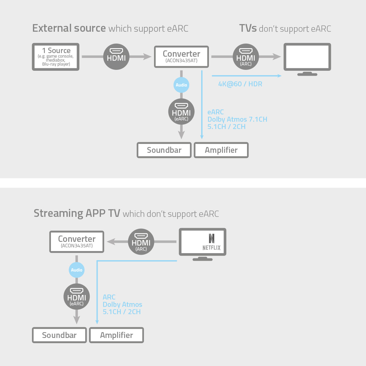 Splits eARC naar ARC en eARC voor hoogwaardige audio. Ondersteunt Dolby Atmos, DTS:X en meer. Ideaal voor streaming naar je soundbar of receiver.