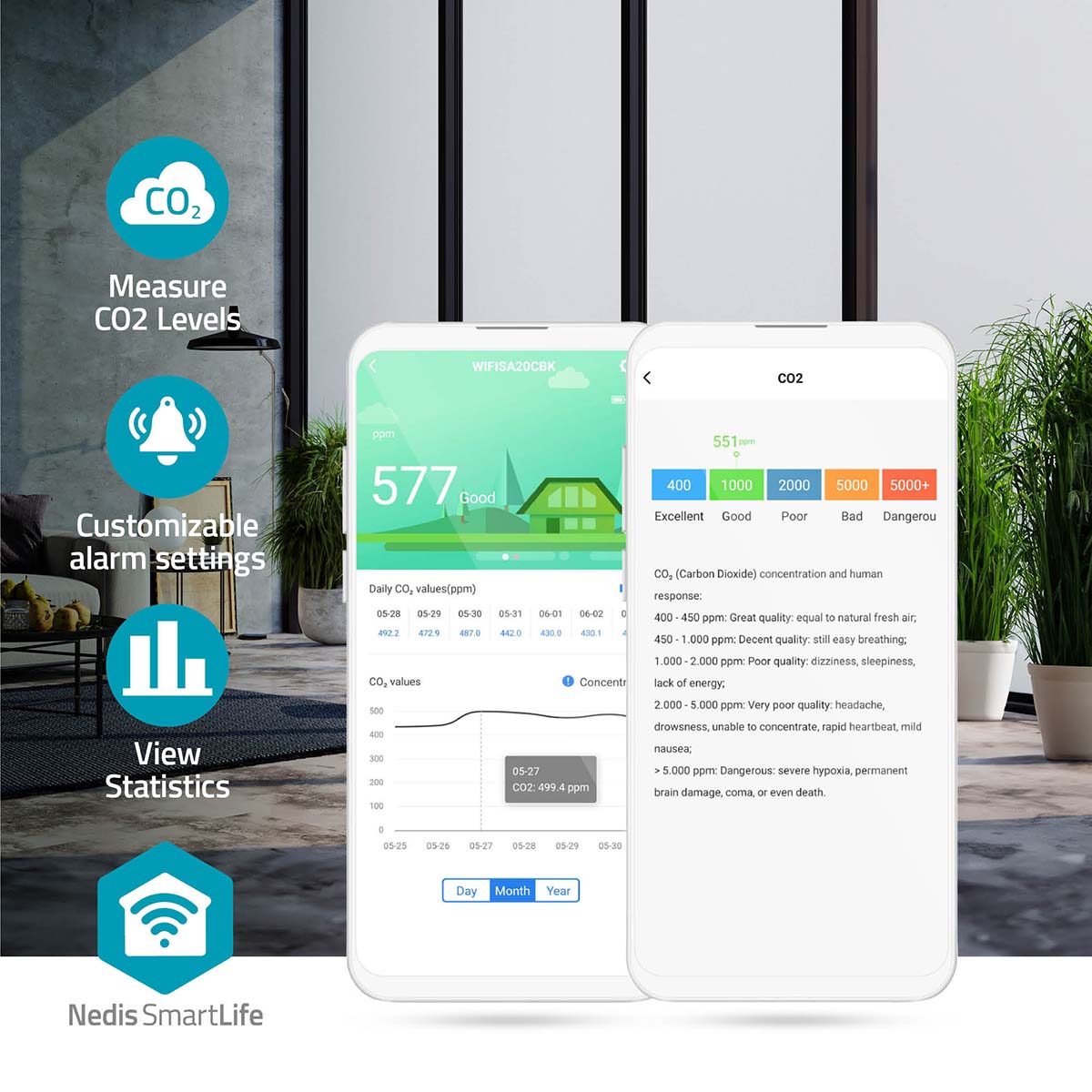 De akoestische en visuele alarmfunctie zorgt voor uw welzijn door u te waarschuwen wanneer de CO2-concentraties binnenshuis de vooraf bepaalde waarden overschrijden. Daarnaast stuurt het automatische meldingen naar de Nedis SmartLife-app, zodat je de luchtkwaliteit op afstand kunt monitoren.