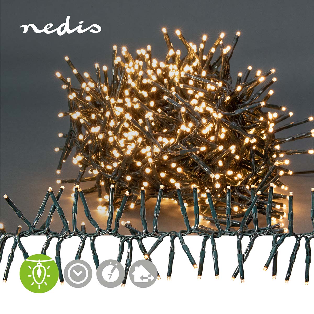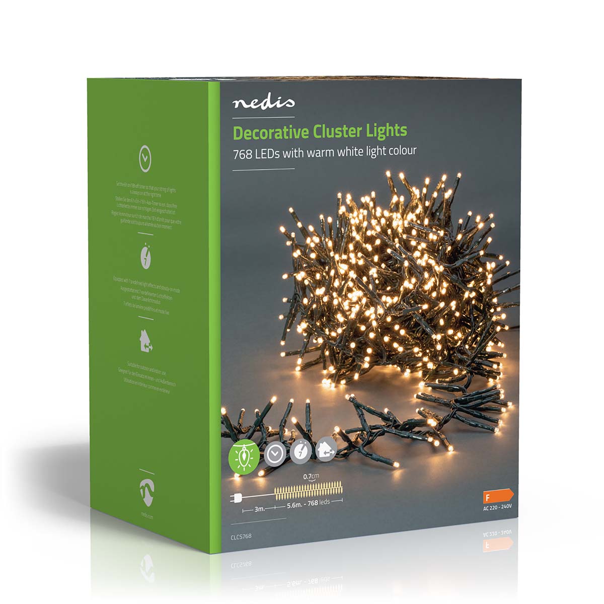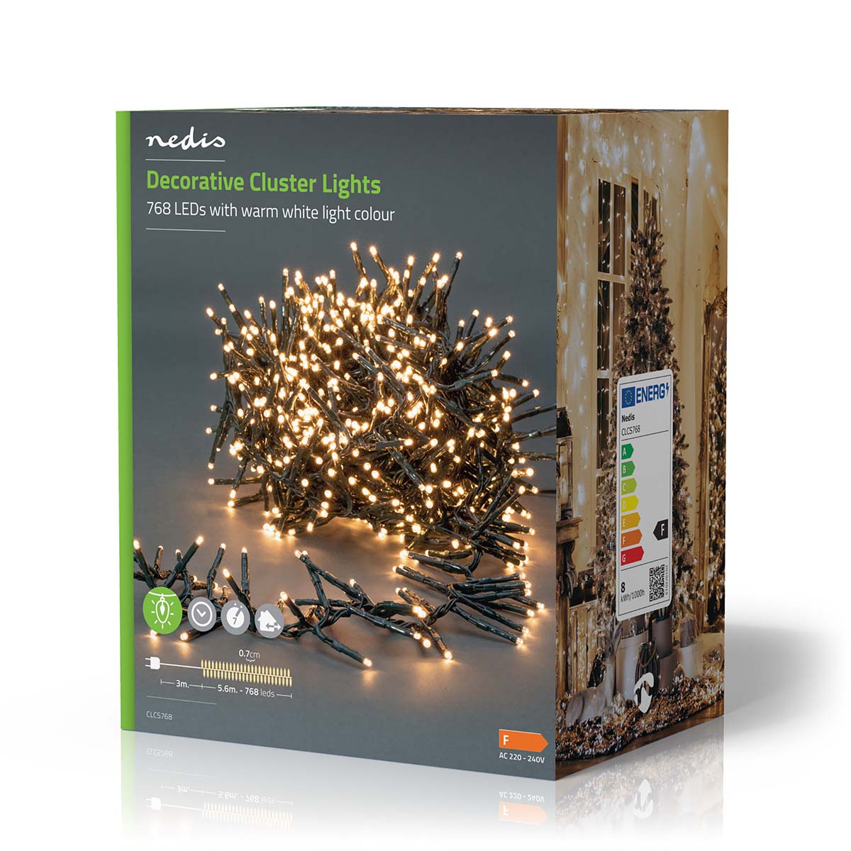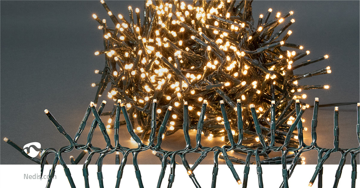 Creëer ultieme kerstsfeer met 768 warm witte LED's! 5,6m verlichting met 7 effecten, timer en groene kabel. Voor binnen & buiten. Totale lengte 8,6m - perfect voor elke boom!