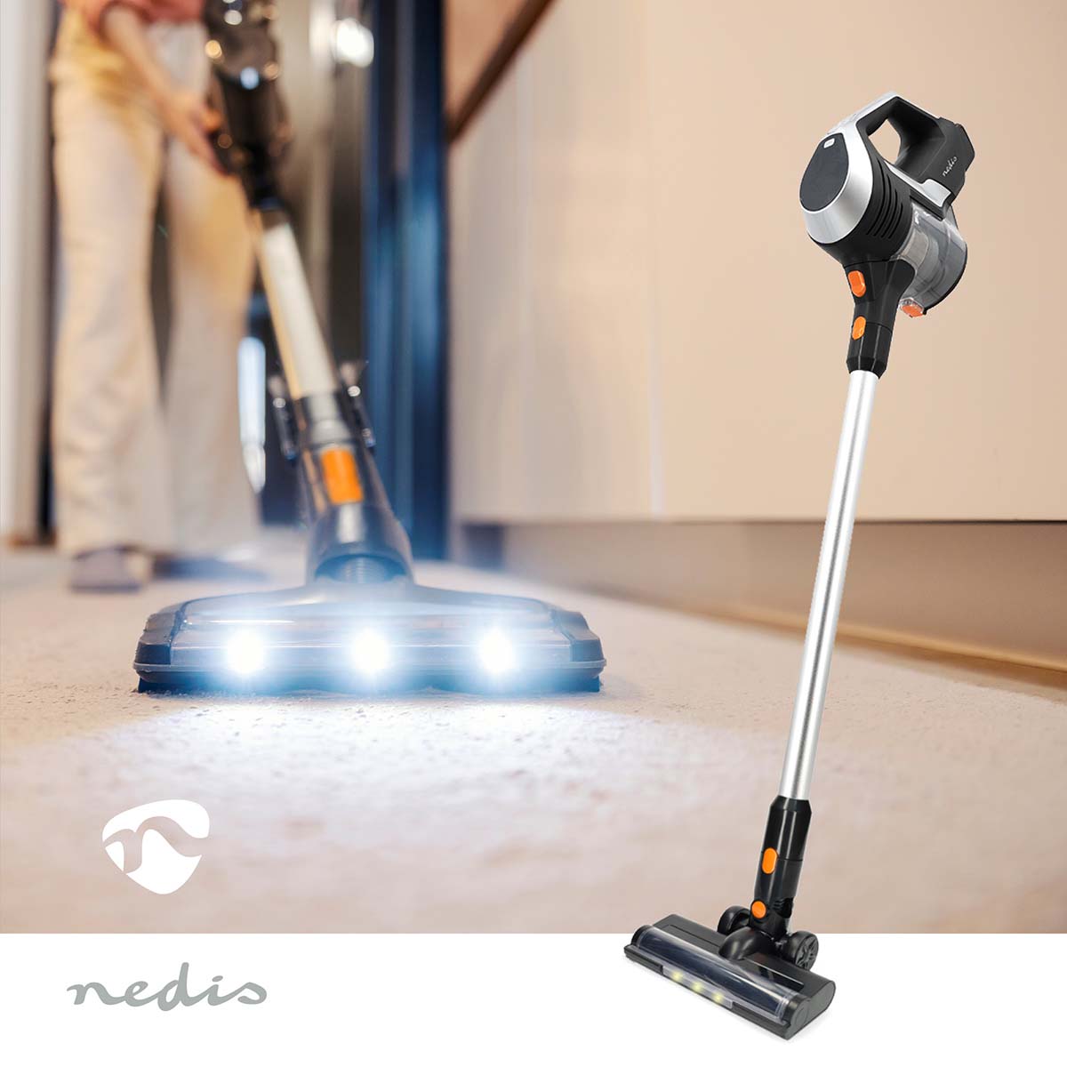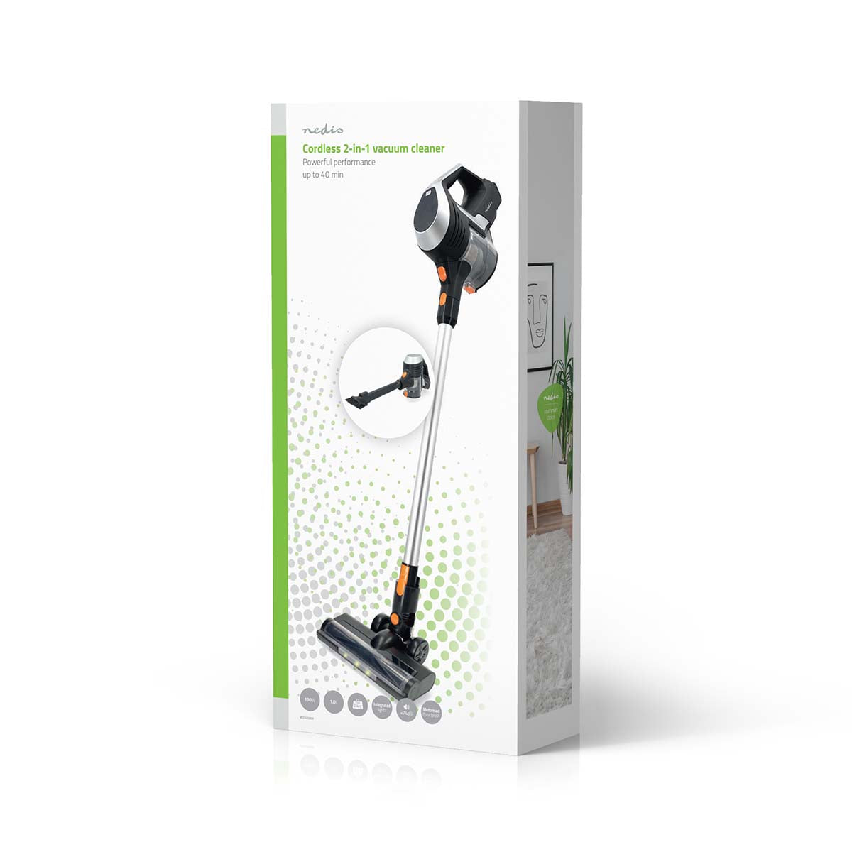 Met de Nedis snoerloze 2-in-1 hand- en steelstofzuiger ervaar je de vrijheid van een snoerloze stofzuiger in combinatie met een krachtige zuigkracht van 130 Watt - ideaal om je huis snel en grondig schoon te maken. Met tot 40 minuten onafgebroken zuigkracht stofzuig je moeiteloos je hele huis in één keer, zonder het gedoe van vaak opladen.