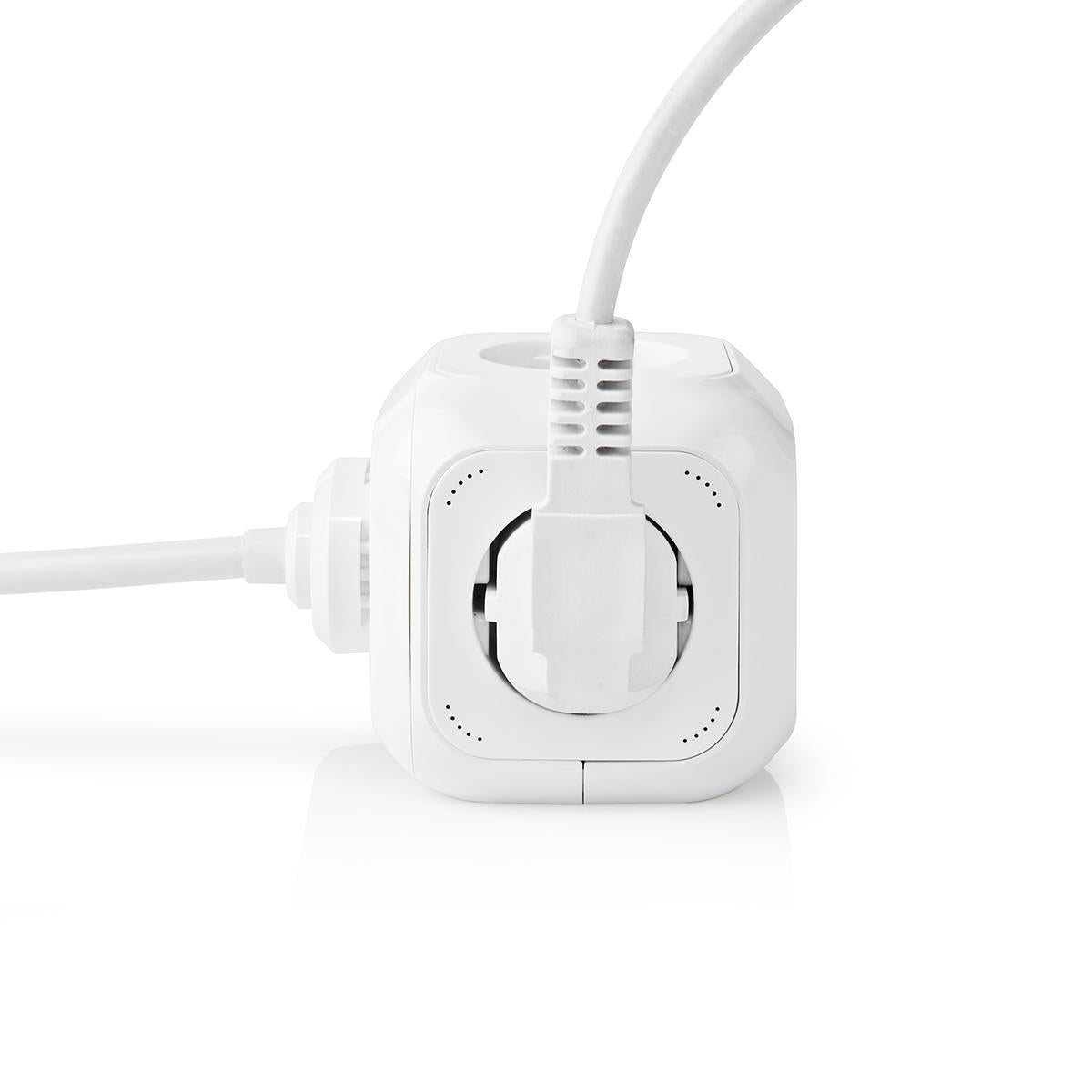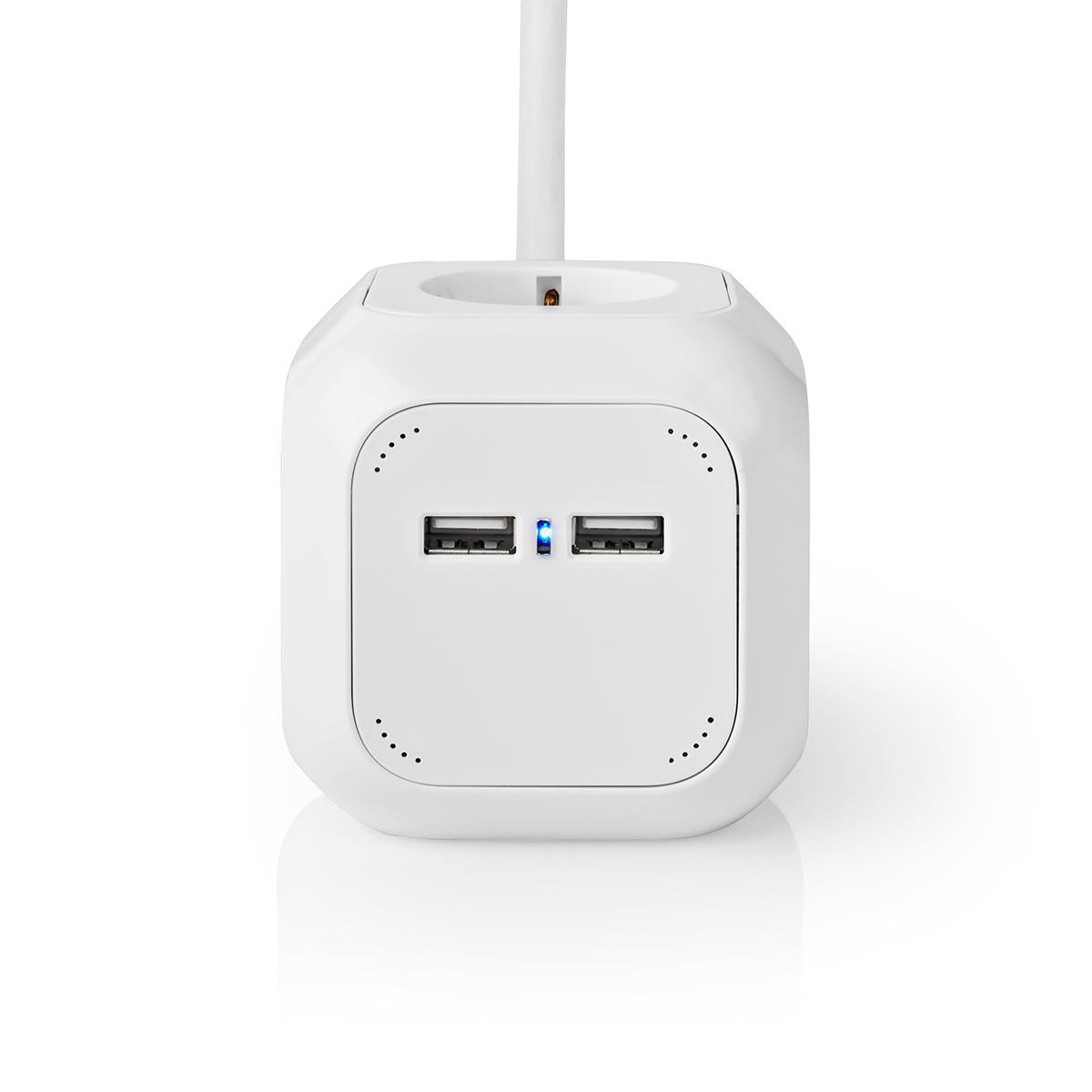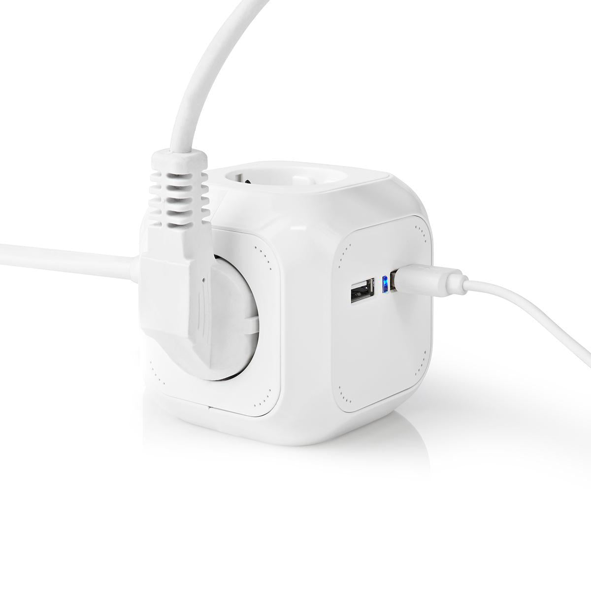 Kubusvormige stekkerdoos met 4 stopcontacten en 2 USB-poorten. Extra dikke kabel voor maximale veiligheid. Compact design, ideaal voor thuis en kantoor.