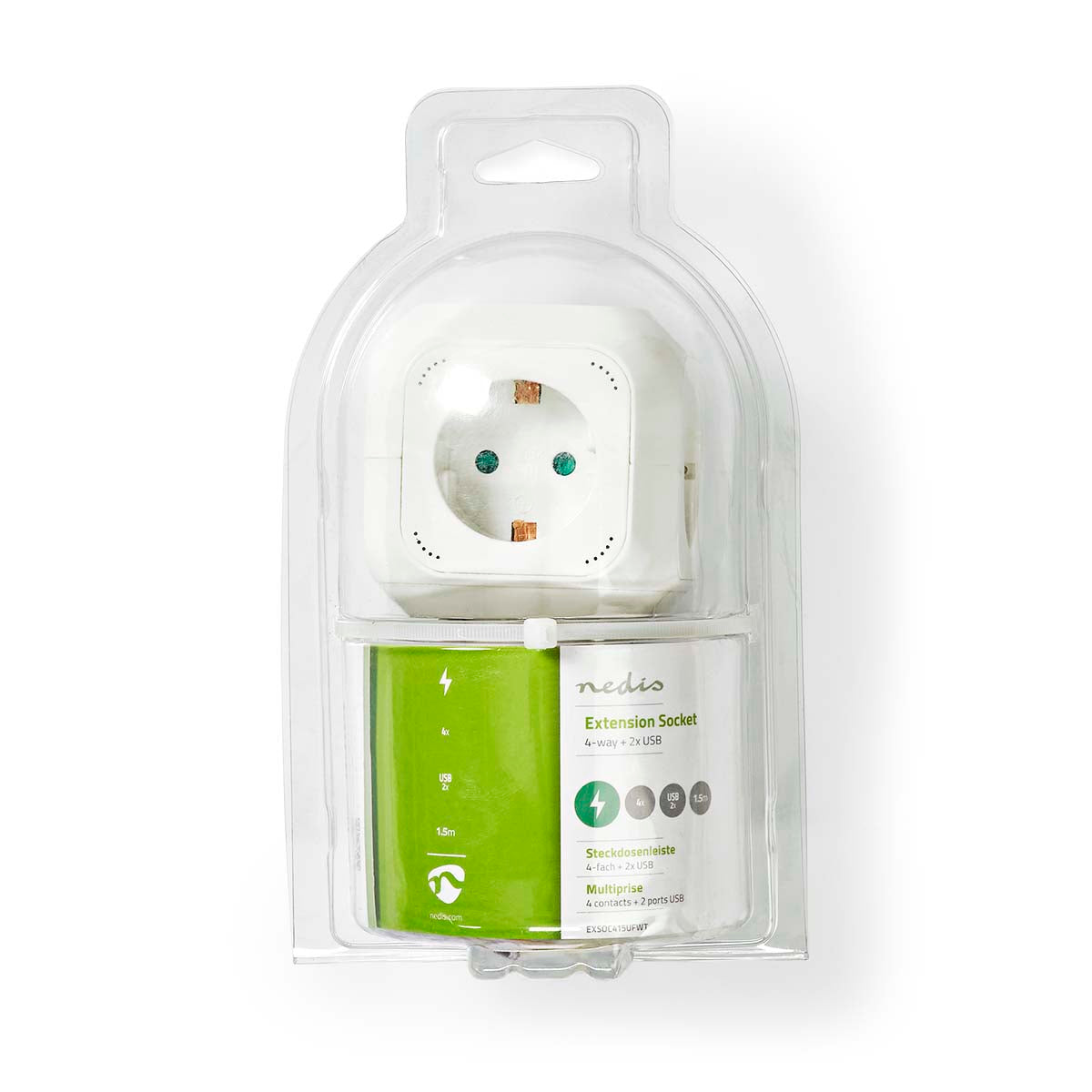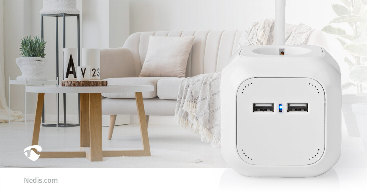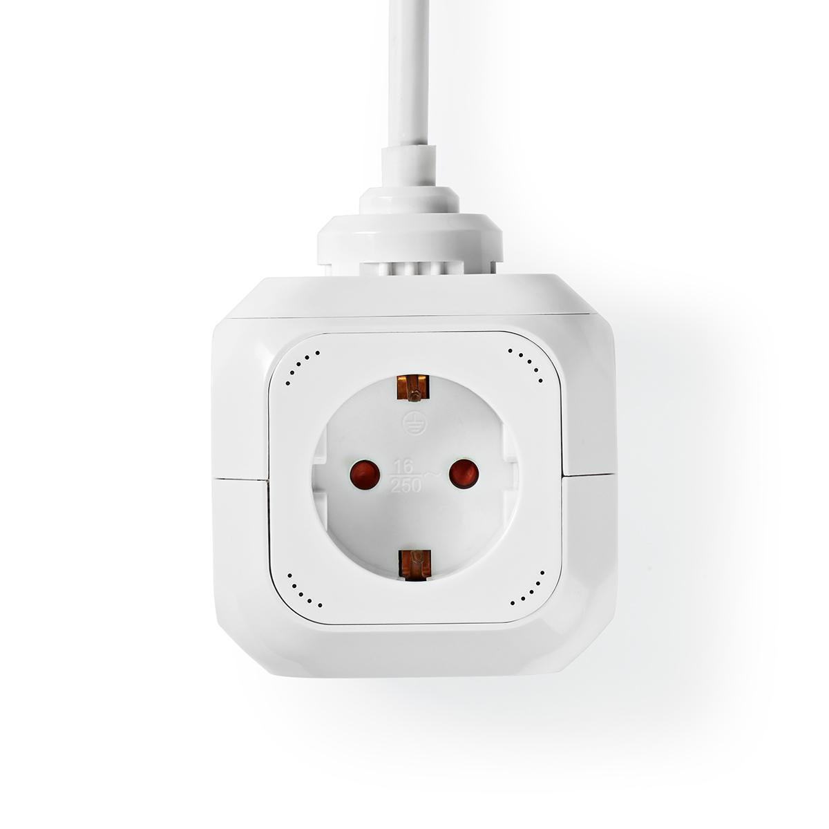 Kubusvormige stekkerdoos met 4 stopcontacten en 2 USB-poorten. Extra dikke kabel voor maximale veiligheid. Compact design, ideaal voor thuis en kantoor.