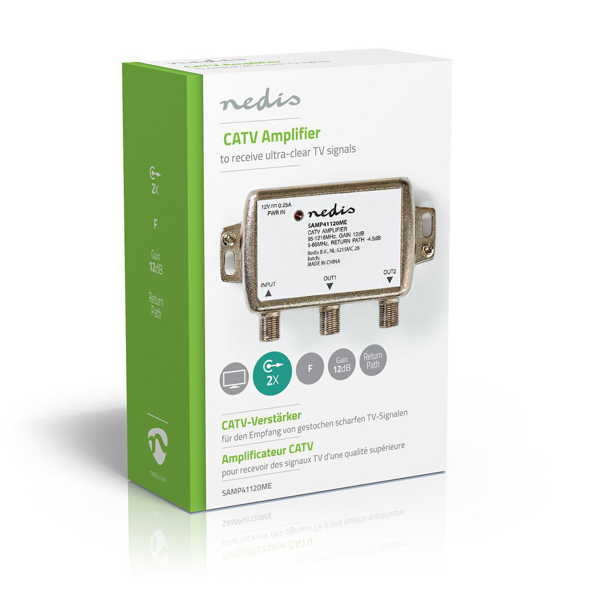 Deze CATV-versterker biedt één uitgang voor ultraheldere TV-signalen met een versterking van 9 dB wanneer deze is aangesloten op uw televisie.