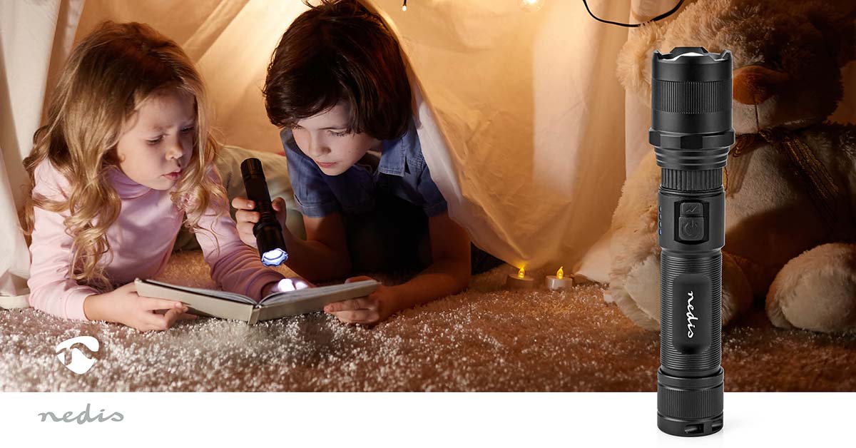 Deze krachtige oplaadbare Nedis LED zaklamp heeft een instelbare focusbundel van een klein spotlicht tot groot gericht licht. De robuuste behuizing van aluminiumlegering, met verborgen USB-C-oplaadpoort in de behuizing, stelt u in staat om de meegeleverde 18650 Li-ion batterij gemakkelijk op te laden. Op de zaklamp zit ook een stroomindicator 4 blauwe LED's zodat je weet wanneer de zaklamp moet worden opgeladen. De zaklamp levert maximaal 1000 lumen op een afstand van 110 meter.