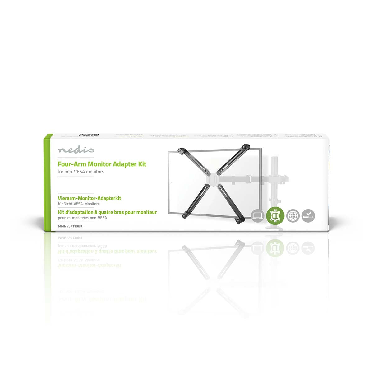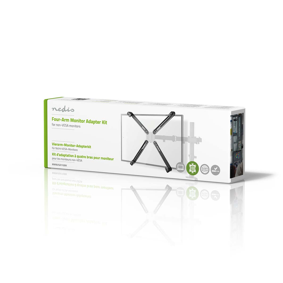 Der Adapter ist für jede VESA-Monitorhalterung mit 75 x 75 mm und 100 x 100 mm Montagelöchern ausgelegt. Es enthält alle erforderlichen Schrauben und andere Hardware für die Montage. Das Kit verwendet ein Vierarmsystem, um sich an die unterschiedlichen Außenmaße von Flachbildschirmen anzupassen und diese sicher einzuklemmen.