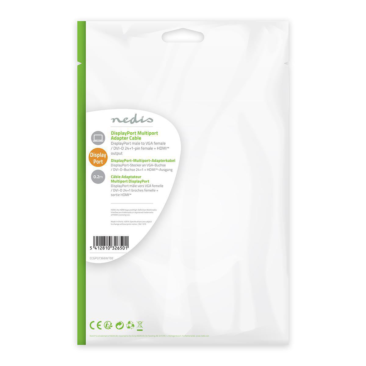 Connect a screen to your notebook with this Nedis DisplayPort adapter cable. The DisplayPort connector has a DVI, a VGA and an HDMI2.0 connector on the other end. This is useful if you want to present something on a screen at a remote location and you don't know what type of screen is present there.