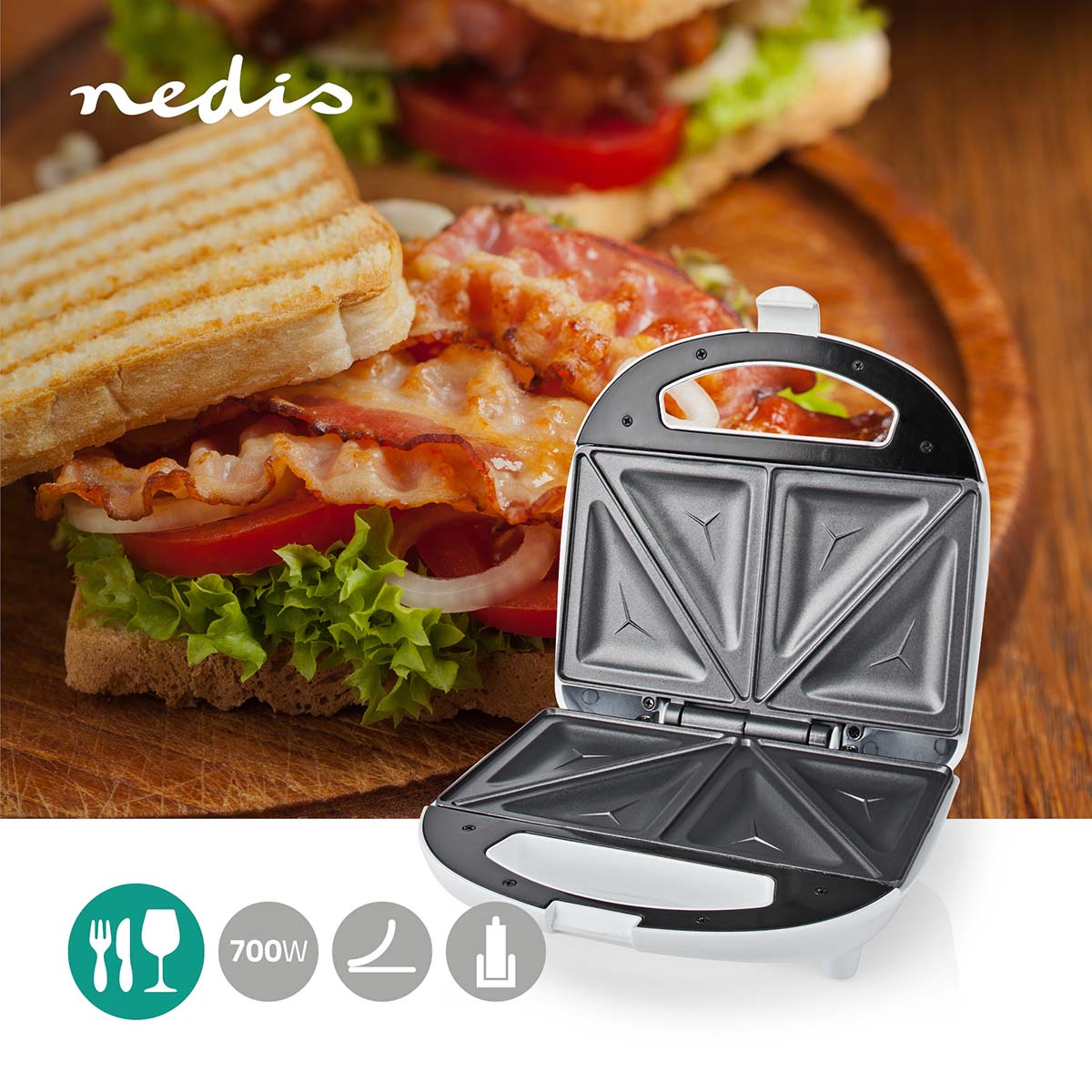 With this 700-Watt powered Nedis sandwich maker, you can toast two sandwiches at once in no time. The power & ready indicator tells you exactly when the device is ready for use. The sandwich maker is fitted with non-stick baking plates that can easily be wiped clean, which makes cleaning effortless and the use of oil or butter unnecessary.