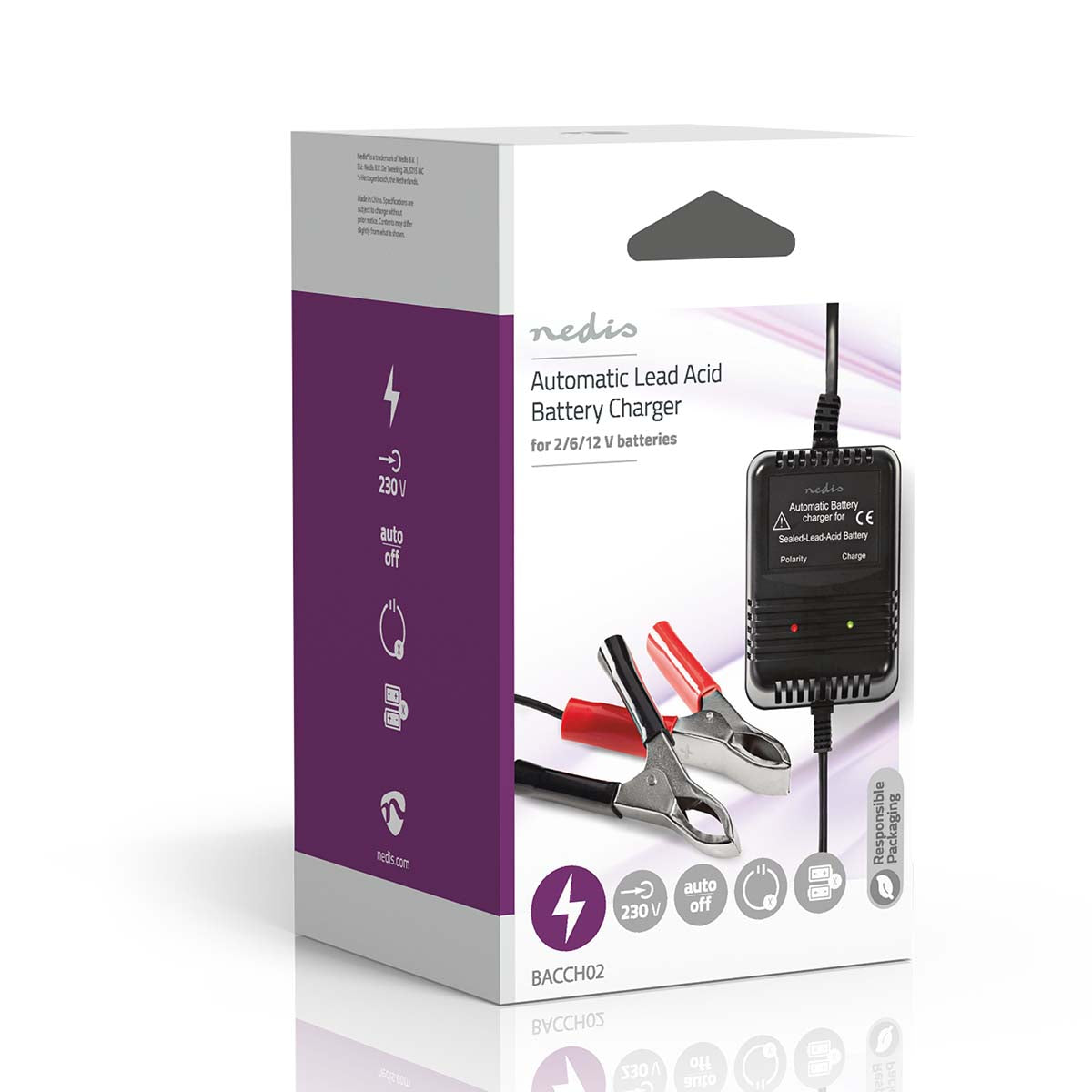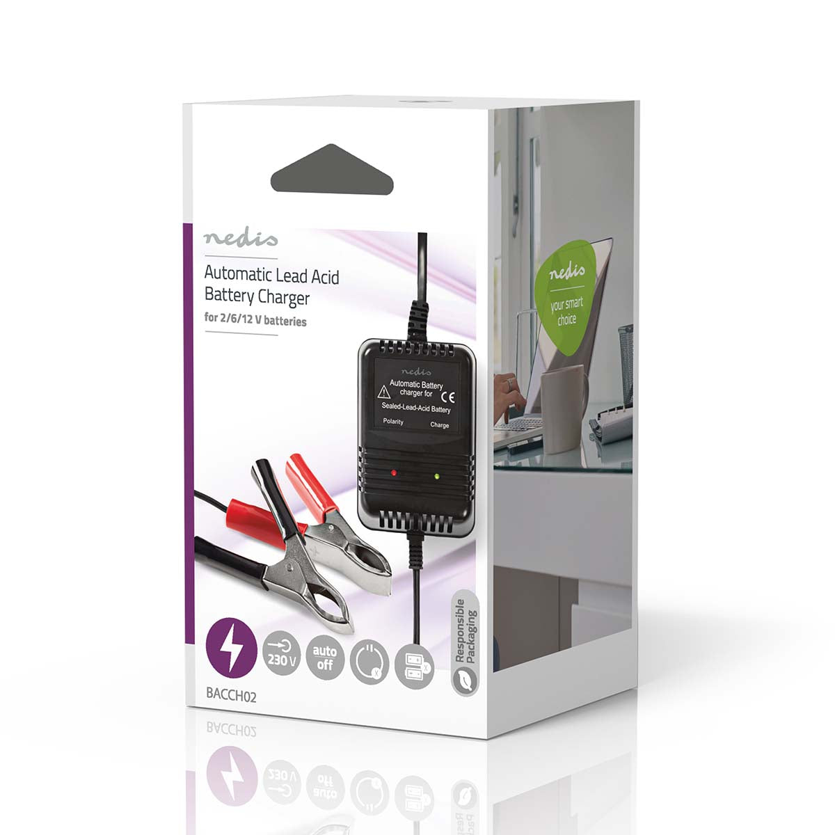Automatic lead-acid battery charger for 2.3/6.9/13.8V batteries. Drip charge function prevents overcharging. Includes short circuit and polarity protection. Suitable for 2.2-10 Ah batteries.