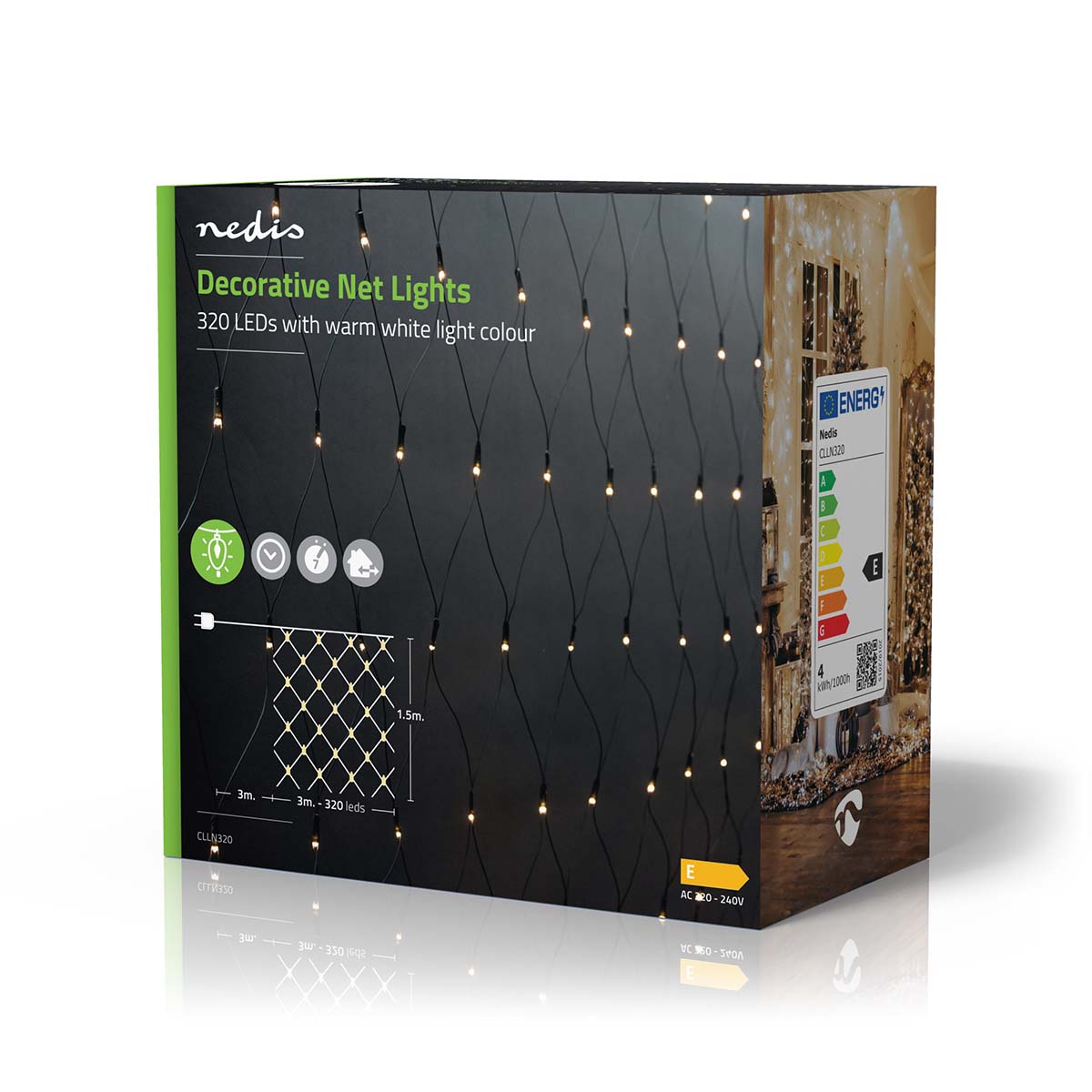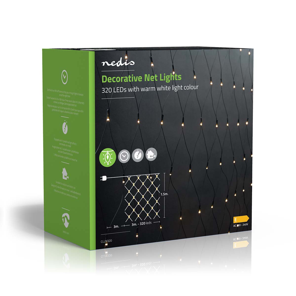 Create instant Christmas atmosphere with 320 warm LEDs on a 3x1.5m net. 7 light effects, convenient timer, and 3m cable. For indoor & outdoor use. Green cable is unobtrusive.