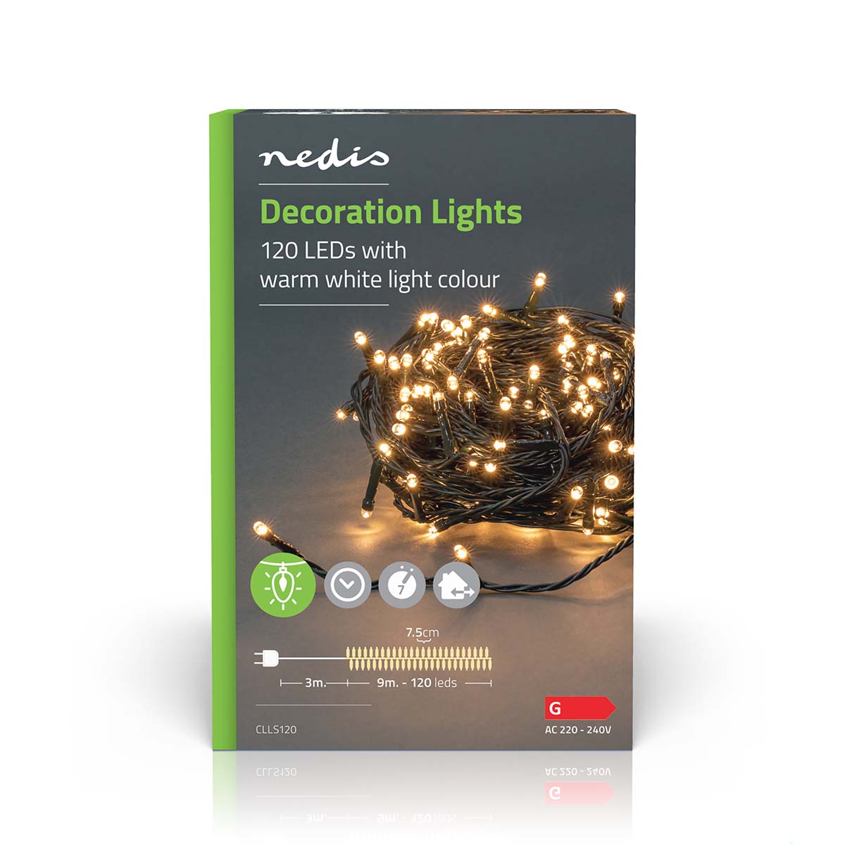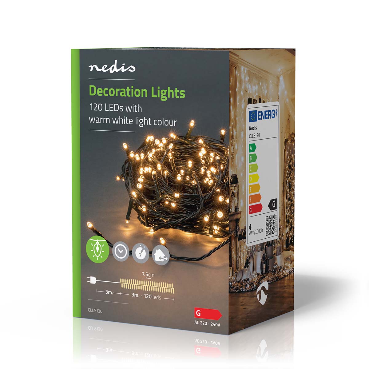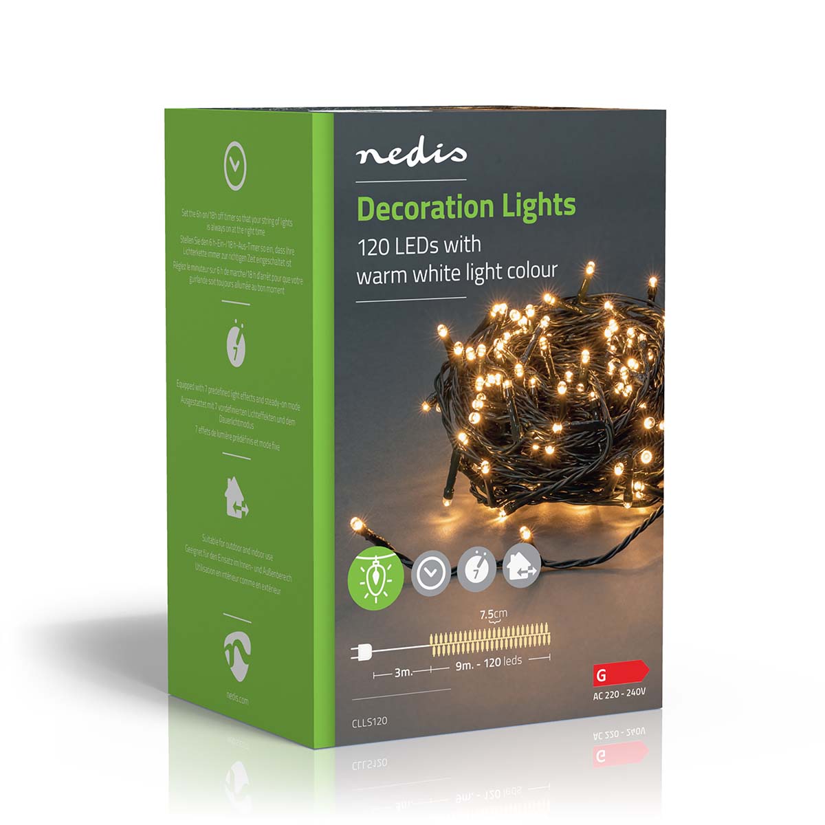 Create instant Christmas atmosphere with 120 warm LEDs on a 9m cord. 7 light effects, convenient timer, and suitable for indoor/outdoor use. Green cable blends in with your tree!