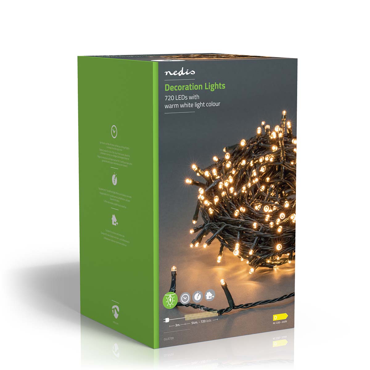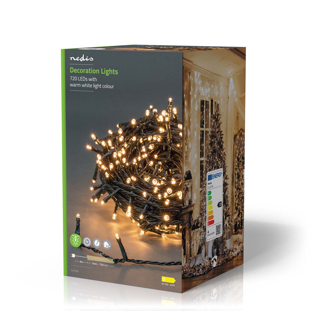 720 LEDs on 54m create a magical Christmas atmosphere! 7 effects, timer function, and for indoor & outdoor use. Green cord is unobtrusive. Transform your house into a fairy tale!