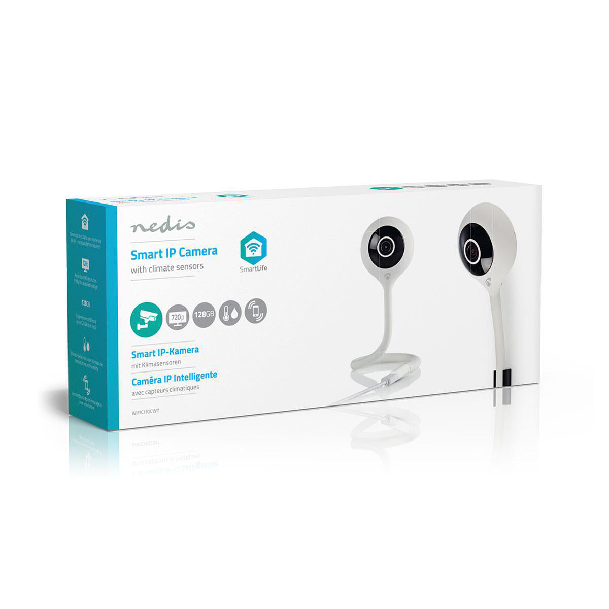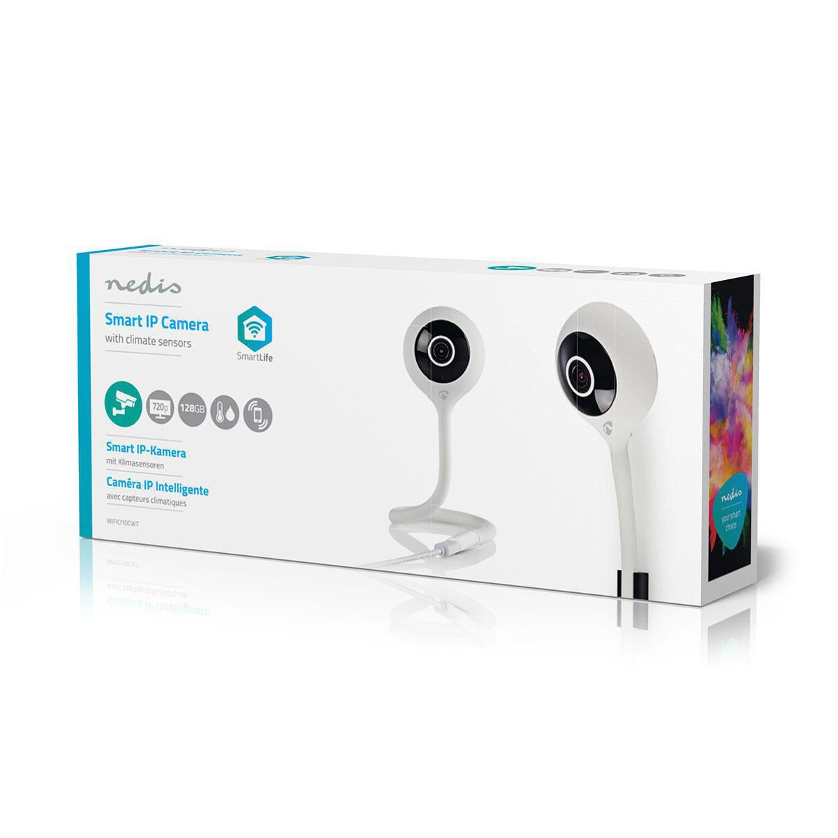 Smart WiFi camera with motion detection, night vision up to 5m, two-way audio, and climate sensor. HD recording on microSD or cloud. No hub needed!