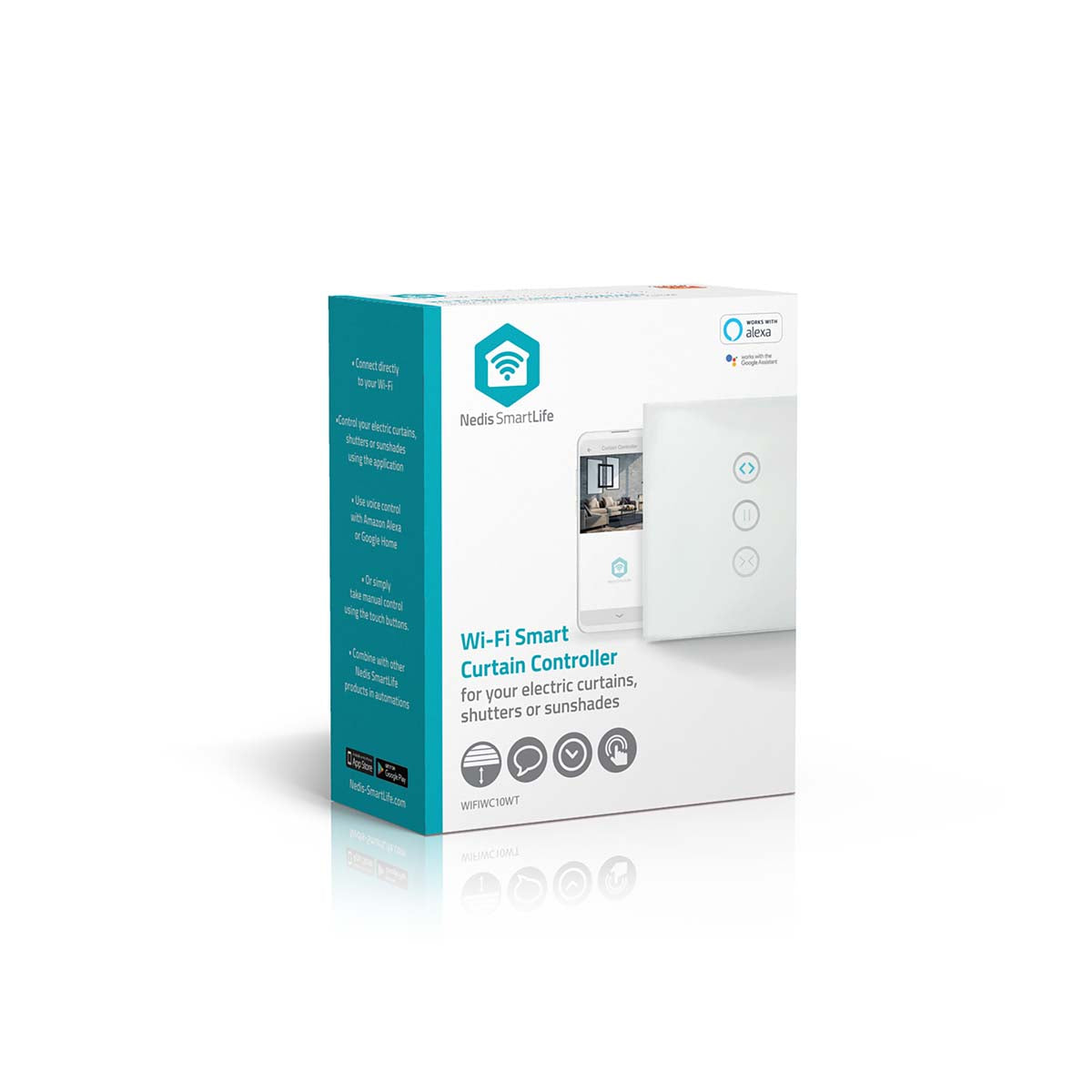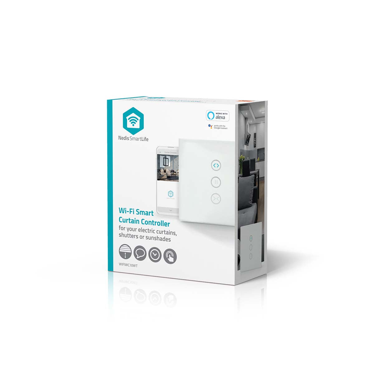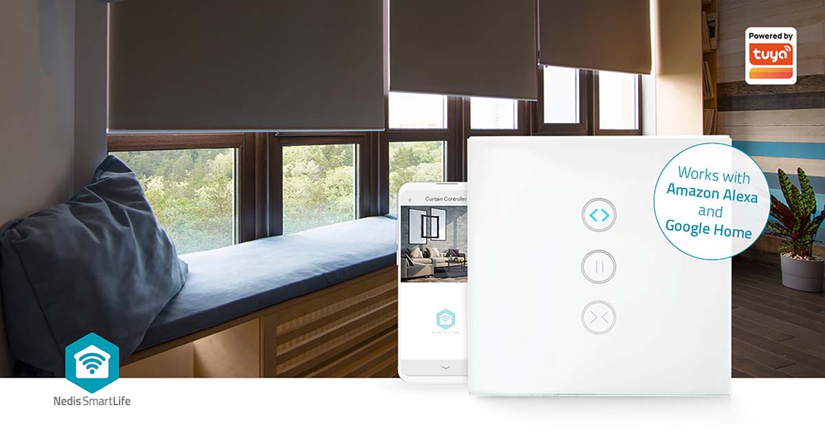Open and close your electric curtains, shutters and sunshades from your smartphone, tablet or with any home voice control devices, such as Amazon Alexa or Google Home. This Smart Curtain Controller can also be set to operate when other Nedis SmartLife are switched on and off, so your curtains close when a light is switched on, for example.