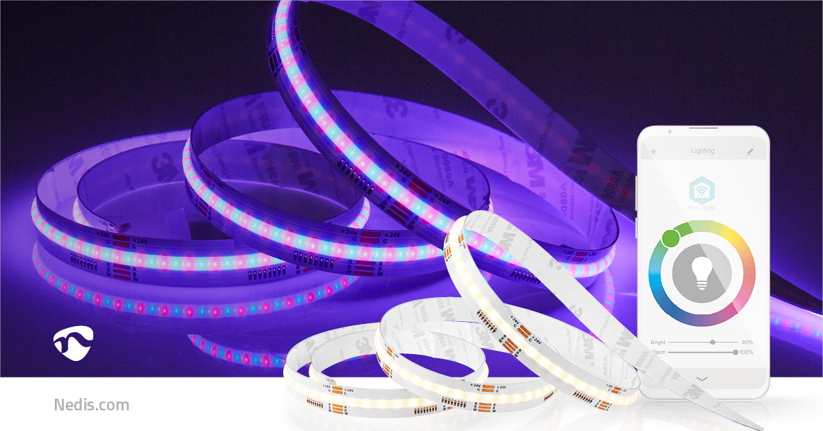 This COB LED strip has a warm to cool white colour and RGB colour scheme so it is very easy to set the preferred colour white by adjusting it in the Nedis SmartLife App.