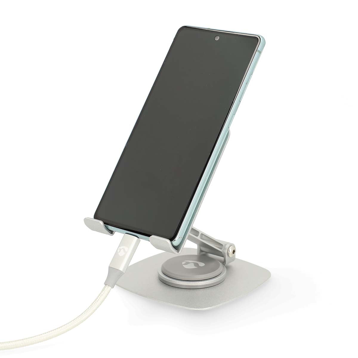 Universal phone holder, 360° rotatable and height adjustable. Foldable aluminum design with anti-slip for stable grip. Charge your phone during use.