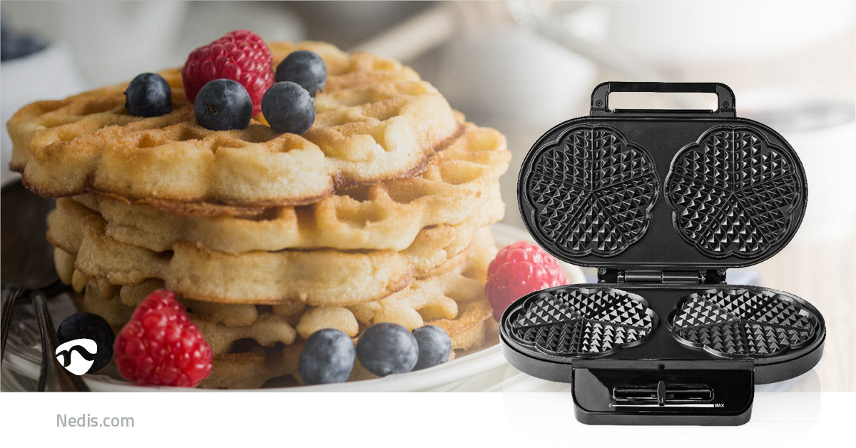 Heart-shaped waffles are ideal for children and adults. This Nedis waffle iron has waffle plates with a non-stick coating. These guarantee easy preparation and are easy to clean. The waffle iron also has two built-in lights. One indicates that the appliance is on; the other that your waffles are ready.