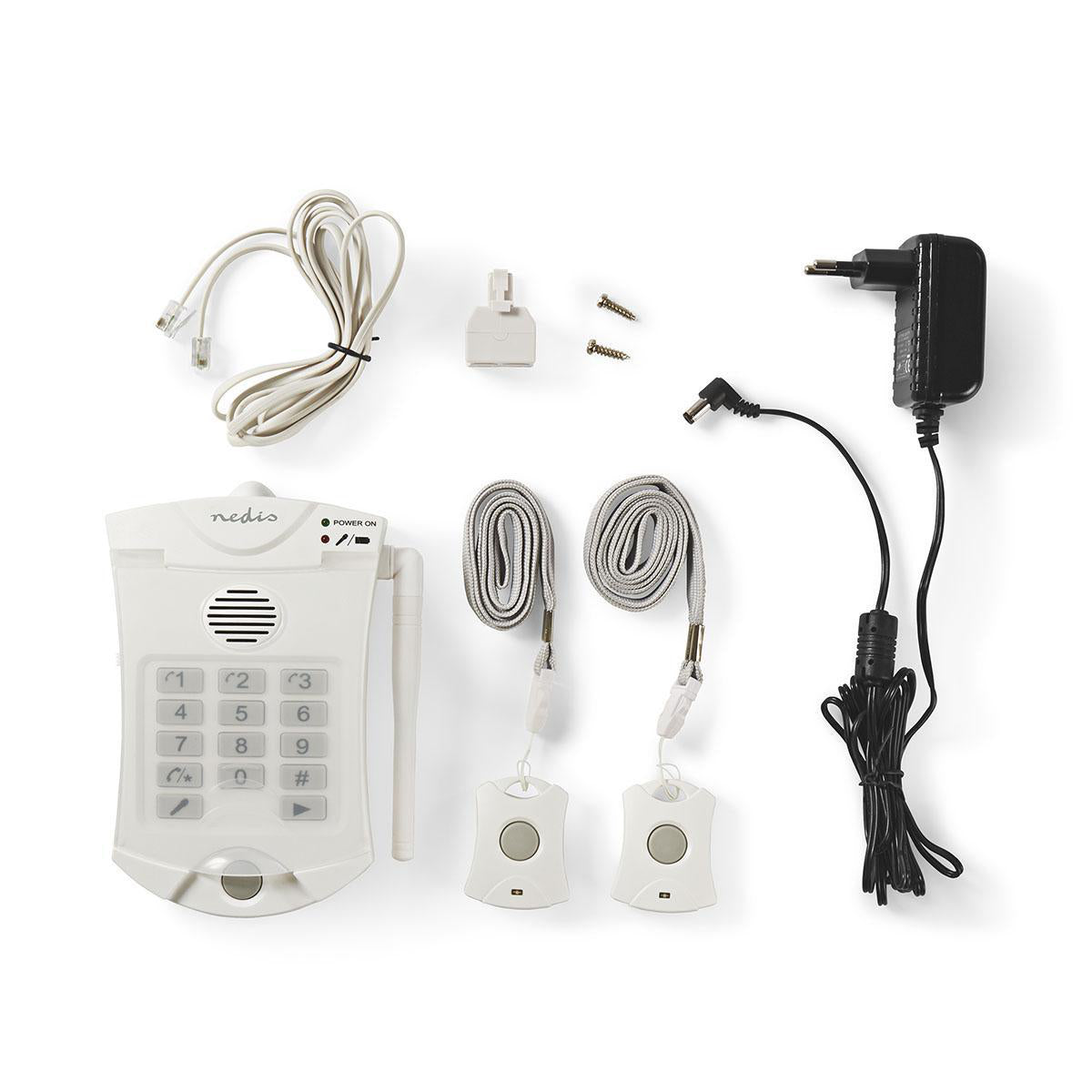 Emergency alarm system with built-in telephone dialler for emergencies. When the panic button on the supplied remote control is pressed, a recorded message plays on a pre-programmed telephone number. There is enough memory for 3 emergency numbers. The receiver activates an intercom connection when he/she presses a numeric key. Ideal for single people who need help quickly in emergency situations. Supplied with neck strap and separate remote control with panic button.