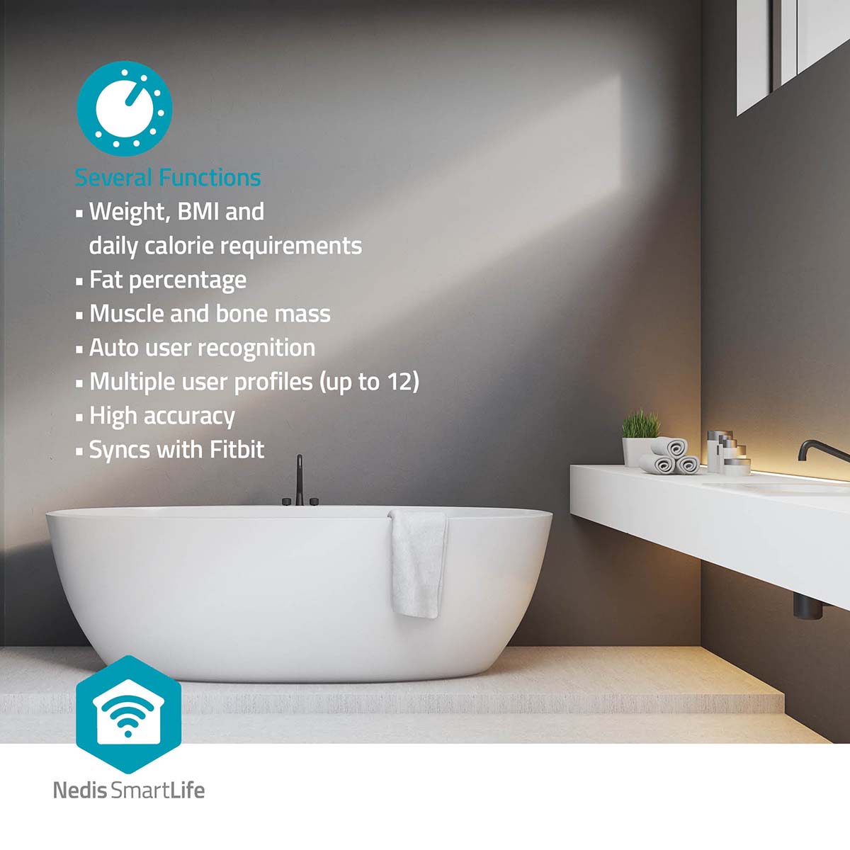 Our Nedis SmartLife app seamlessly integrates with the scale, providing intuitive line chart analysis and easy access to historical data. Visualize your progress effortlessly and stay motivated on your fitness goals. The scale features a clear, digital, white LED display for effortless reading and boasts auto user recognition and large data storage. With support for up to 12 user profiles, this scale is perfect for families or fitness enthusiasts sharing their wellness journey.
