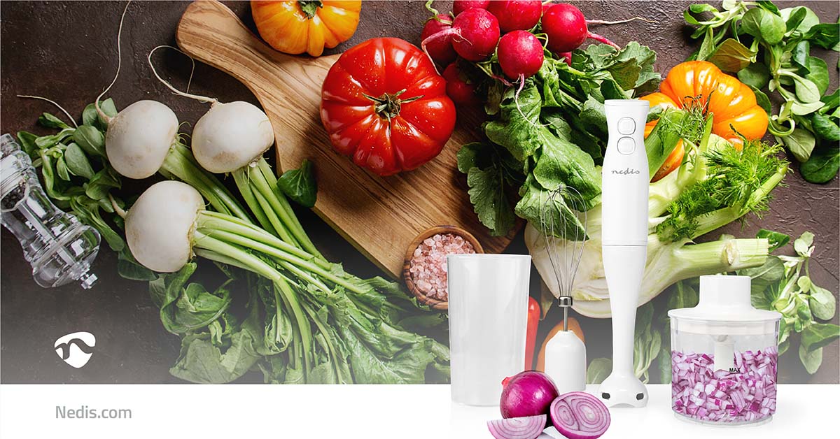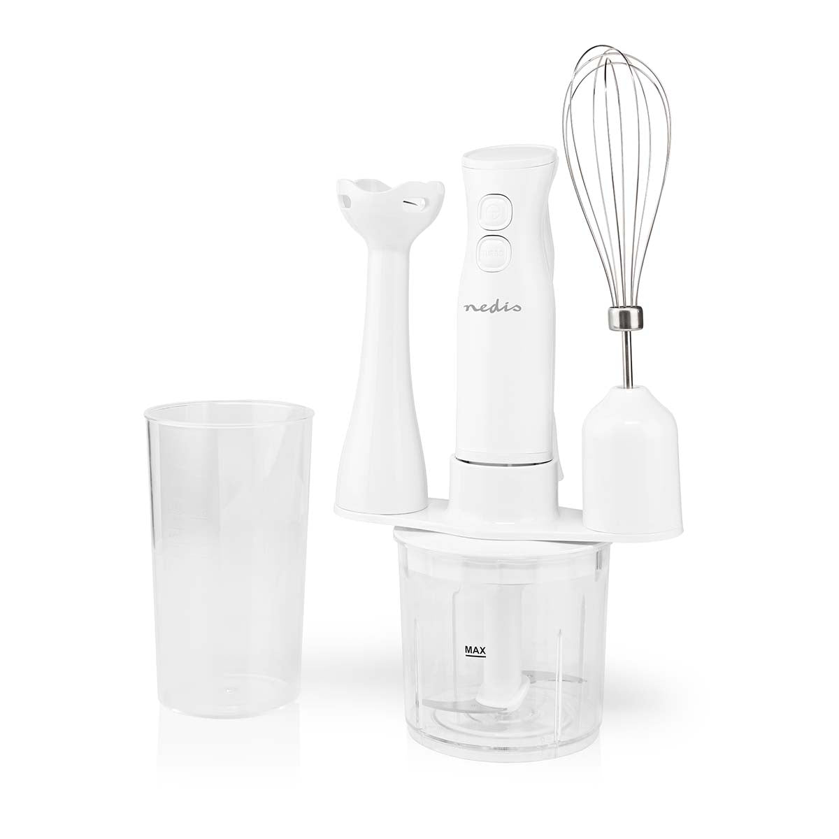 Complete your kitchen with this compact 4-in-1 blender set with a hand blender, a chopper, a whisk and a handy jug. With this set you can easily and quickly make batter, smoothies, soups or sauces.