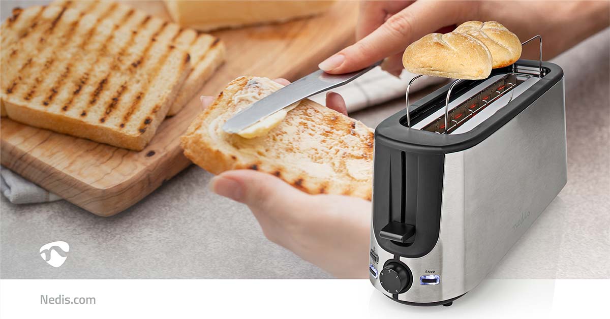 Grille-pain mince avec fente extra longue pour un toast parfait. 6 niveaux de brunissage, fonction décongélation et réchauffage. Comprend un chauffe-petits pains et un tiroir à miettes. Idéal pour un usage quotidien !