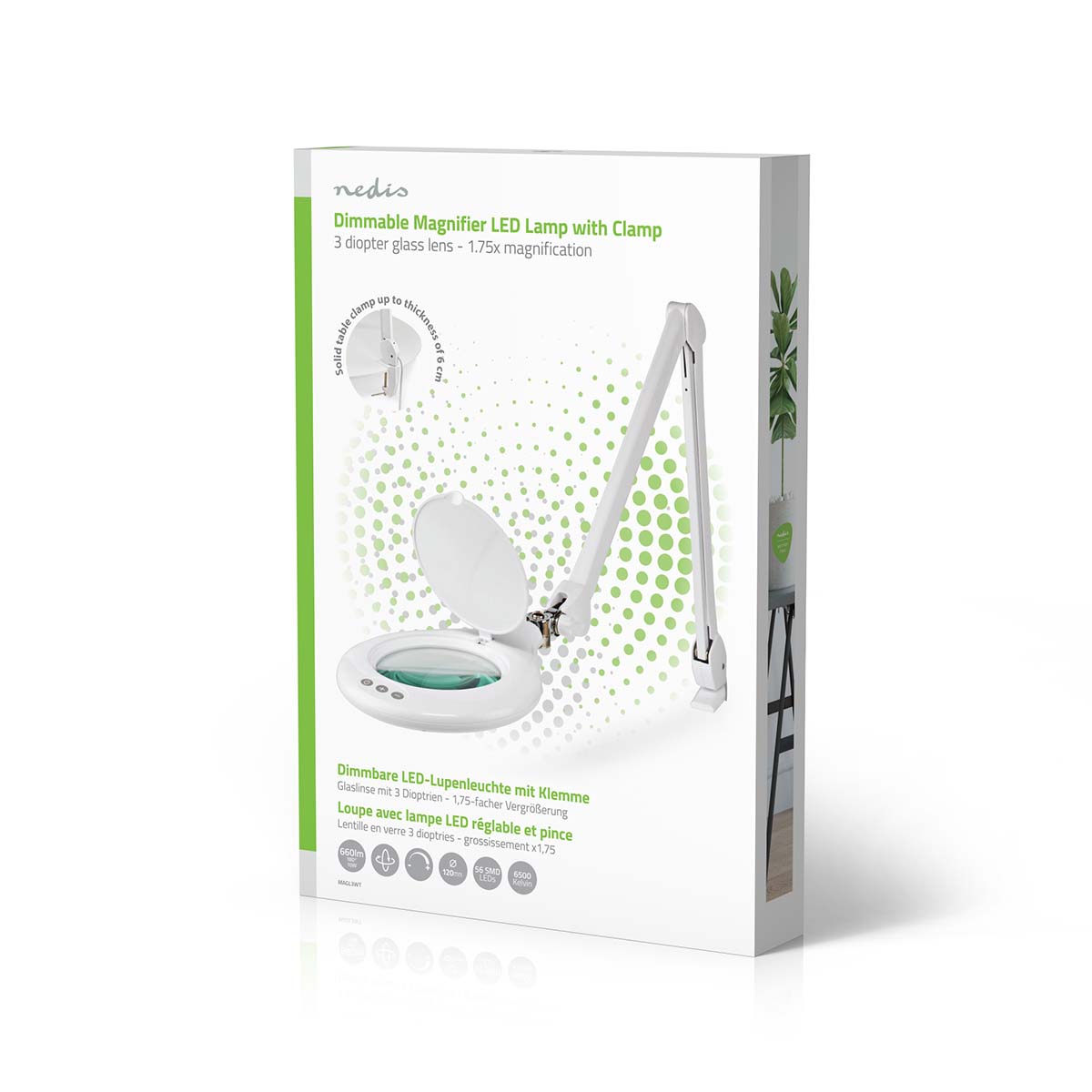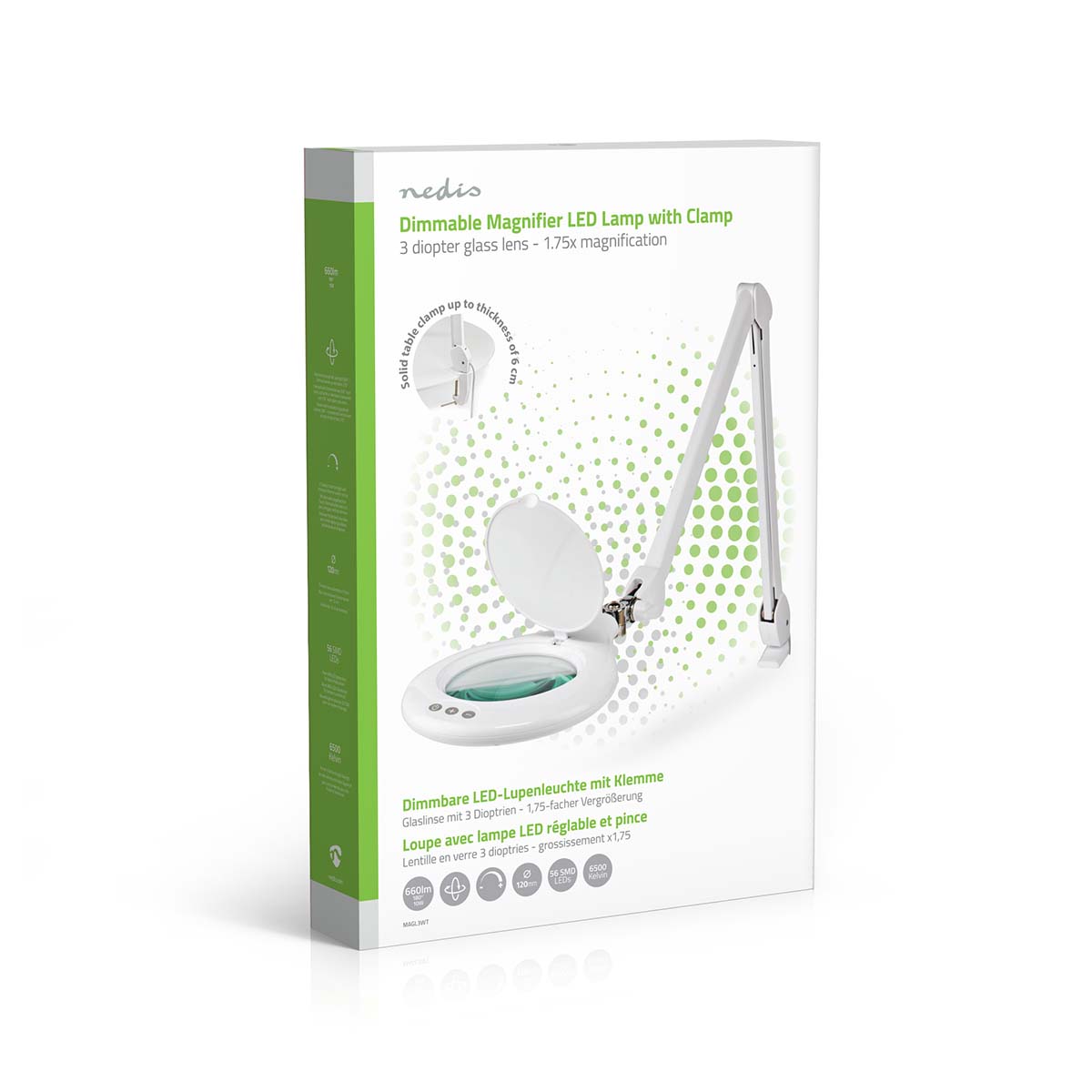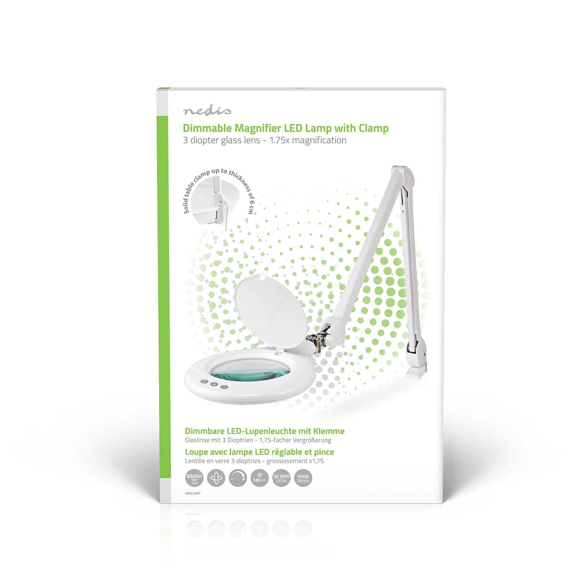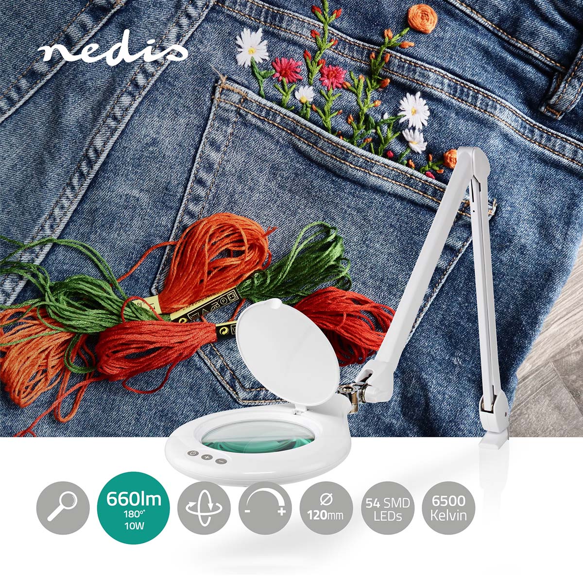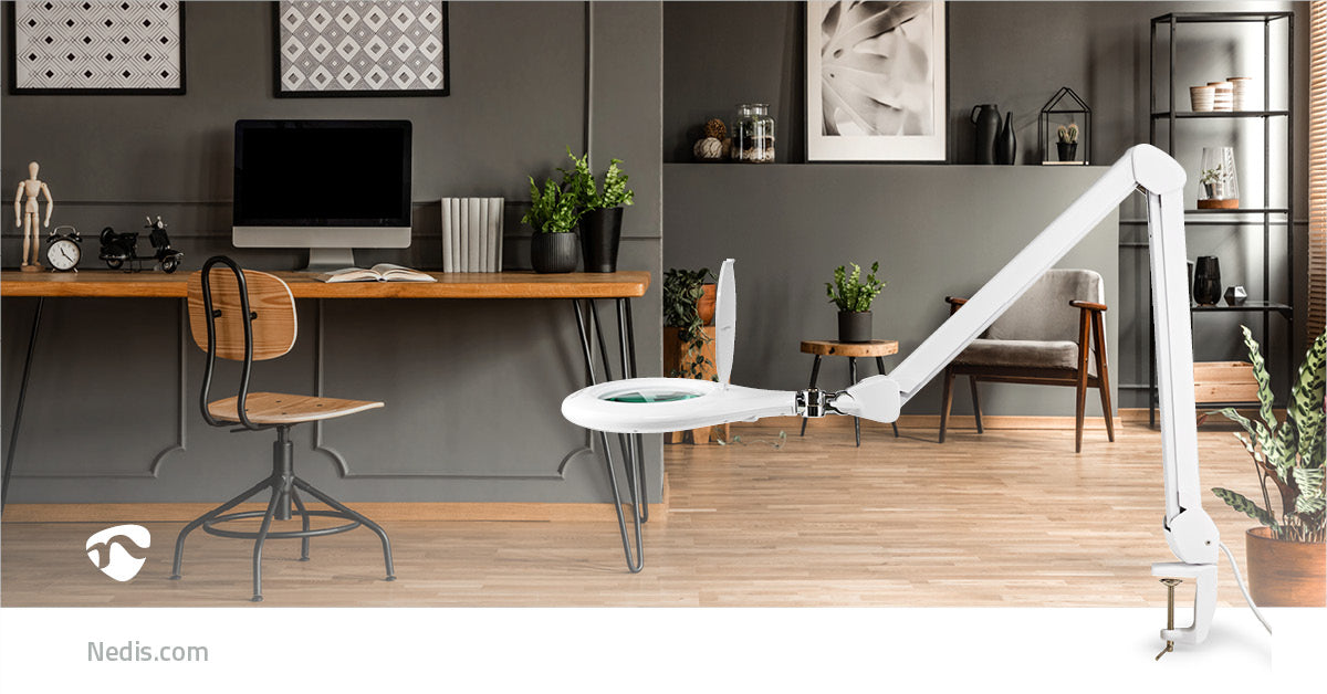 Cette lampe loupe de table blanche Nedis flexible avec fixation pour table est dotée d'un grossissement puissant de 3 dioptries (x1,75). Ce grossissement est rendu possible grâce à une lentille en verre d'un diamètre de 120 millimètres. Atténuez facilement la lumière avec l'interrupteur gradateur tactile situé sur le dessus. Cette lampe-loupe de 10 W est idéale pour les travaux minutieux avec de petites pièces, à la fois pour le travail et pour les loisirs.