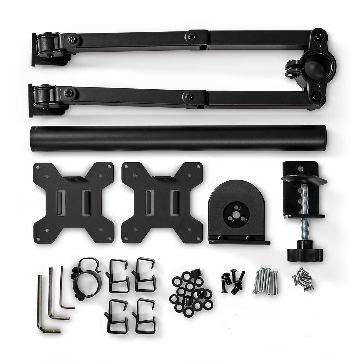 Bras de moniteur gain de place pour 2 écrans jusqu'à 32". Entièrement réglable : inclinez, tournez et pivotez. Montage facile avec pince de bureau. Gestion des câbles incluse pour un bureau ordonné.