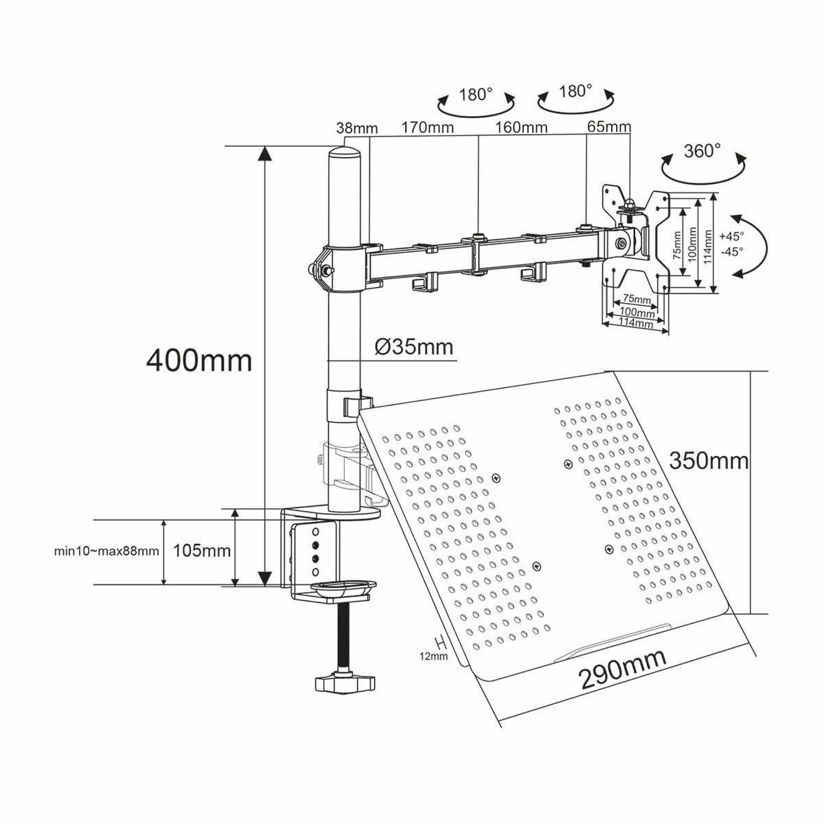 Bras de moniteur gain de place pour écran jusqu'à 32" et ordinateur portable. Entièrement réglable : inclinez, tournez et pivotez. Installation simple avec pince de bureau et gestion des câbles.