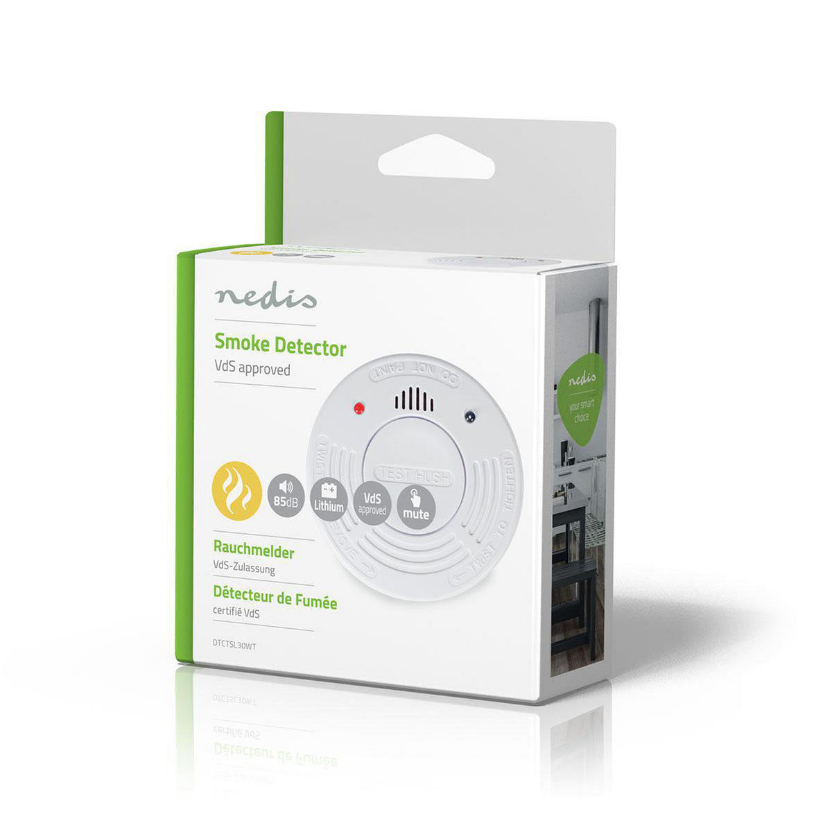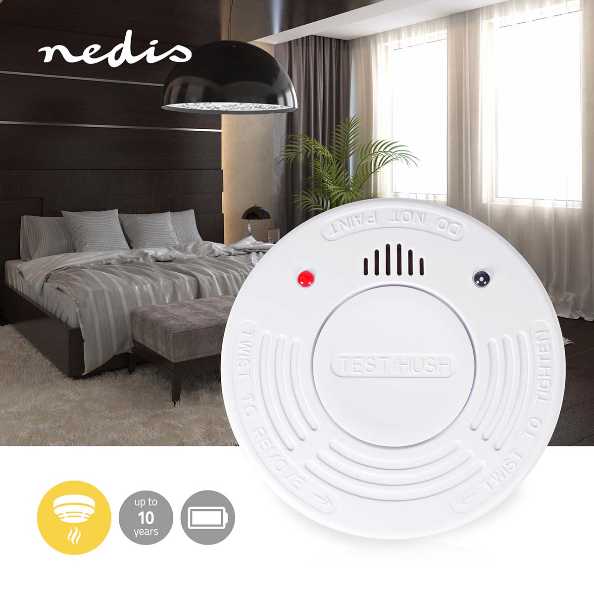 Détecteur de fumée Nedis avec batterie de 10 ans. Alerte incendie précoce pour une sécurité maximale. Grand bouton de test pour une utilisation facile. Conforme à la norme EN 14604.