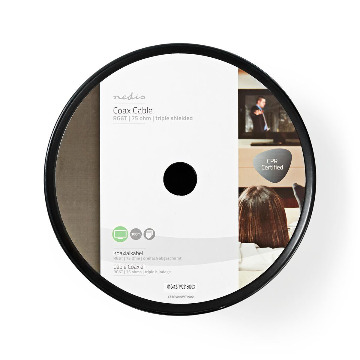 Hoogwaardige coaxkabel op een rol van 10 meter, voor de overdracht van digitale televisiesignalen.