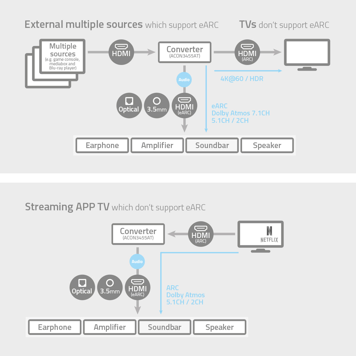 De converter splitst het eARC-signaal van je eARC-apparaten in een ARC-signaal voor je tv en eARC voor je SoundBar en HiFi-entertainmentsysteem.